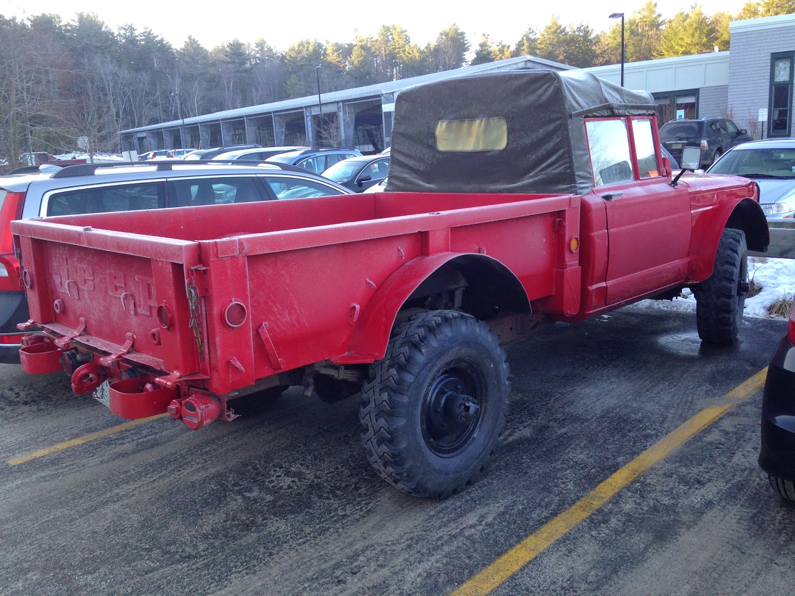 Caught the Jeep in Freeport ME. A bunch were produced for the Vietnam-era military but I understand that the contract was cancelled before the entire run was delivered. Many of them ended up in fire departments around the country. The owner of this low-mileage unit bought it from the Goffstown NH Fire Department. These machines were heavy-duty: they were called 5/4 (five-quarter) ton trucks.
