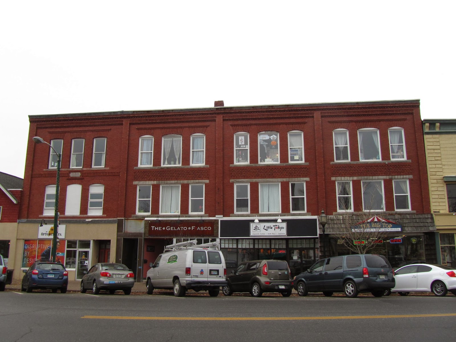 That's the old mill complex, on the Androscoggin River, at the end of Maine Street. The problem with most main streets in Maine---and BTW, in Brunswick, it's Maine Street--is too much traffic. The road ends up feeling like a highway, and pedestrians are intimidated--it just doesn't feel good to be there. Brunswick's downtown is livelier than most but it still doesn't compare to the urban bustle you'd find in a town this size in Western Europe, where planning tends to manage traffic better, and keeping towns alive as civic space is a widely-shared value. The fact that Maine Street is lined with three and four story 19th century commercial buildings is a problem that Main Streets all across America have to deal with. People don't want to walk up flights of stairs to visit say, the dentist, or a lawyer.