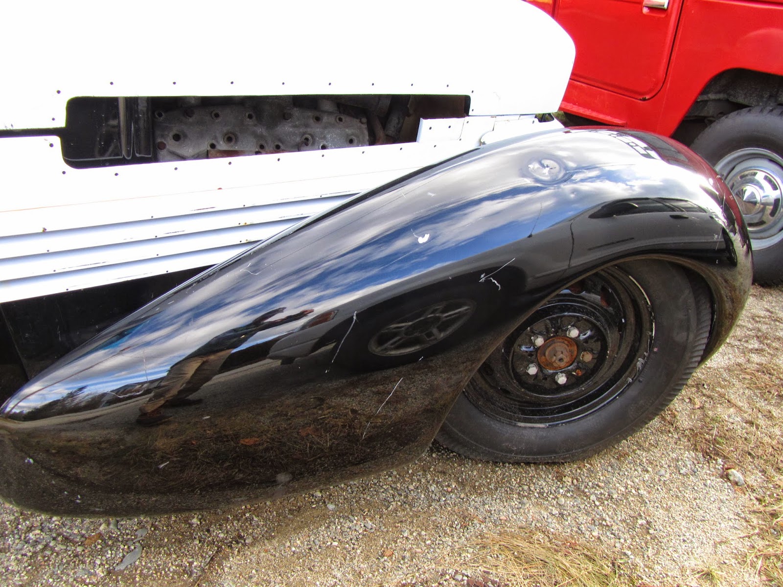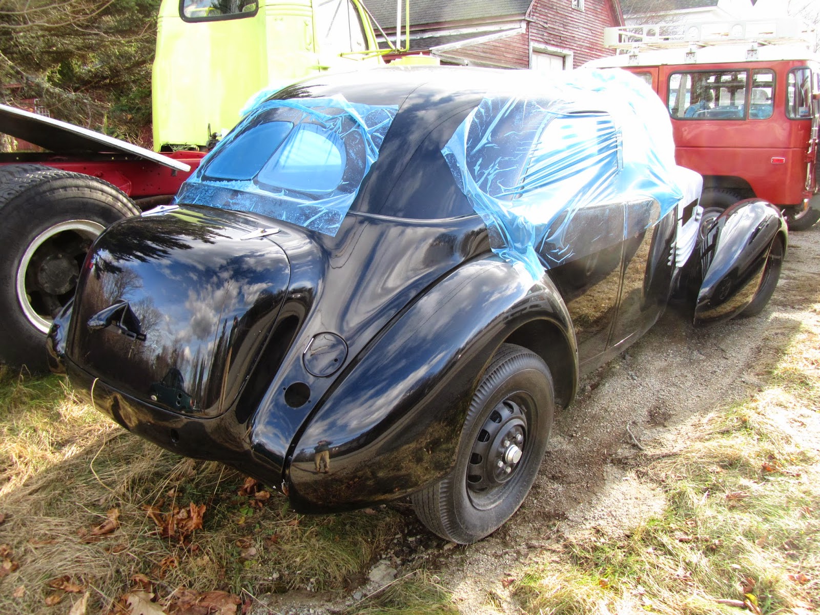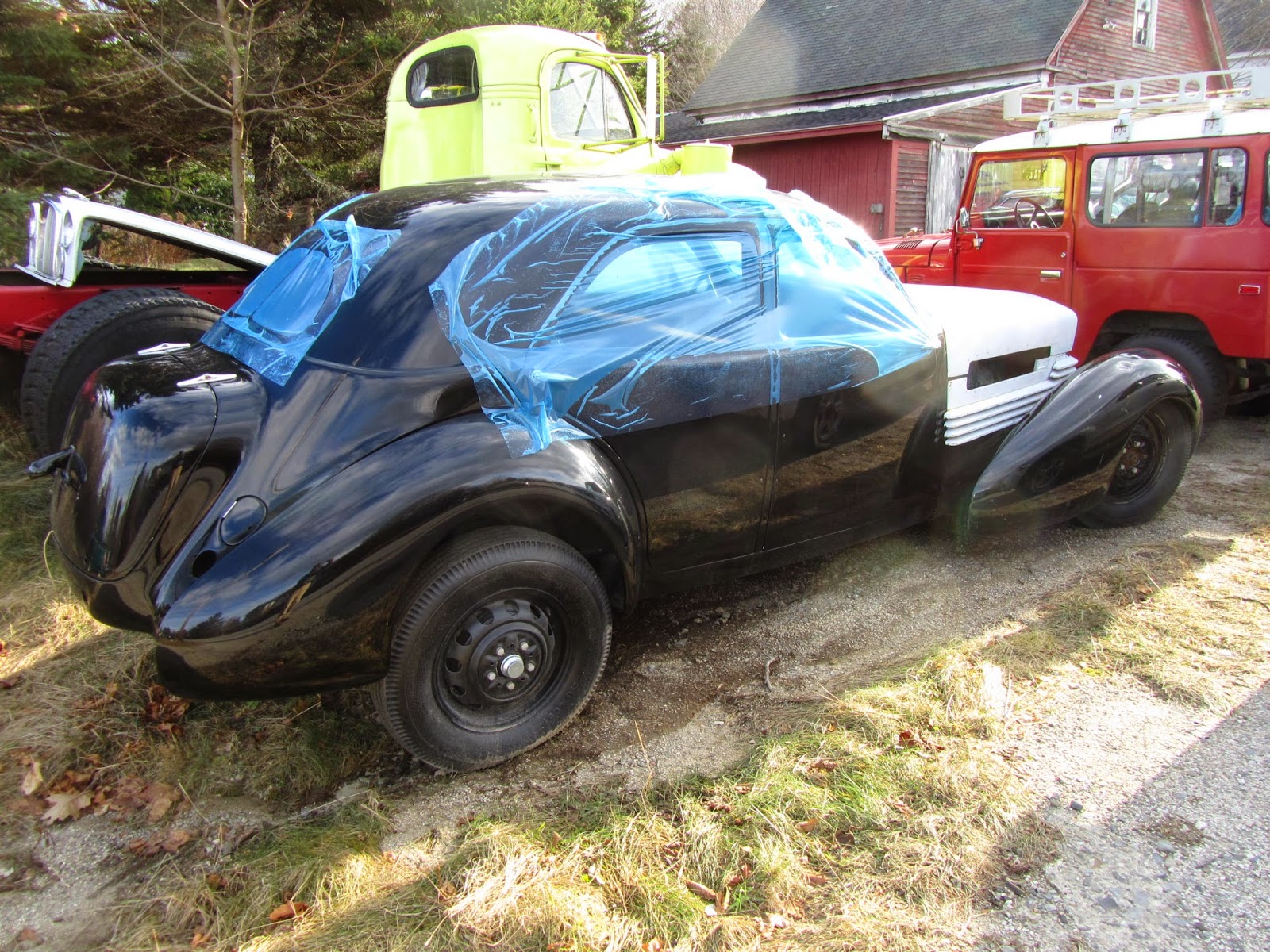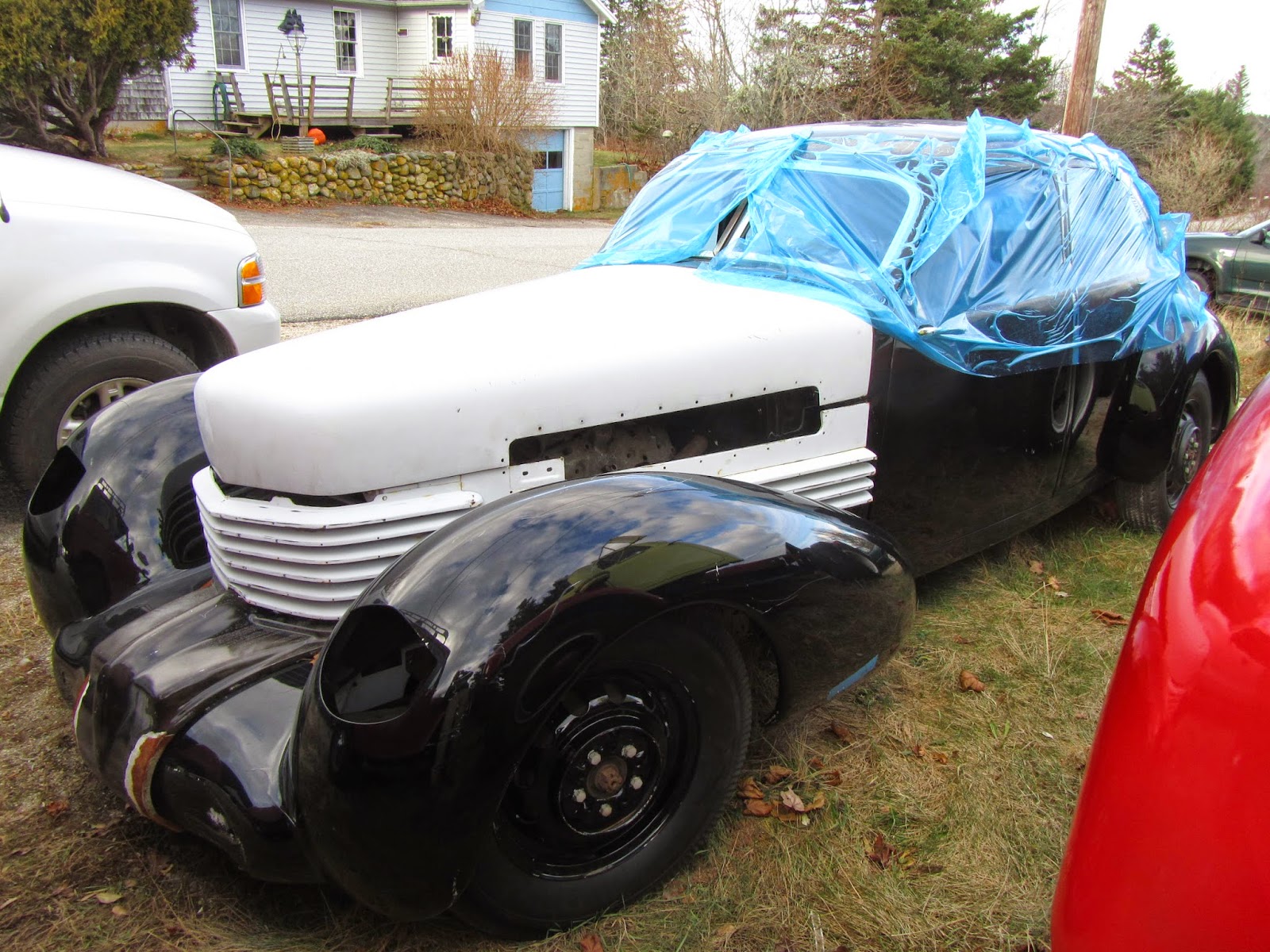The car was at Sean McKay's shop, Affordable Performance, out on the Naskeag Road. We've been there before. With a Lycoming engine and a trailer full of parts, I don't how affordable the Cord will be, but it'll certainly be a performer. These were called bustle-backs because the profile of the rear was reminiscent of that women's fashion moment of the 1890s.