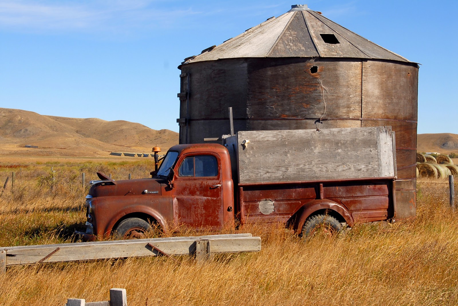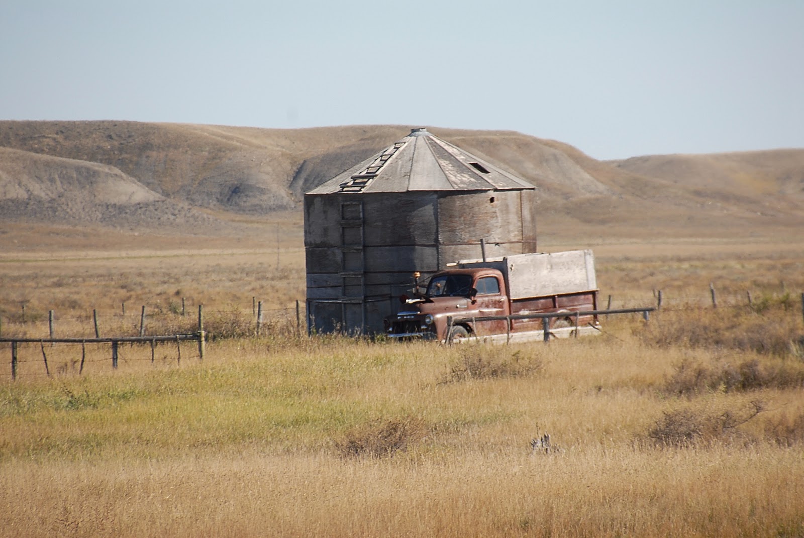 From Alex Emond: "Just upstream from Val Marie, Saskatchewan the Frenchman River has been dammed to create a reservoir called Lake Newton. There is a huge common pasture around that lake ... nothing's been plowed. This is one area where the deer and the antelope play. Always good for birds. Those are Sandhill Cranes in the last shot. Way up high, with a plaintive , melodic cry...there were hundreds on the wing that mid-October morning."The Fargo has become part of the landscape. Note the way they made the open flaps in the hood to help with overheating."---AE