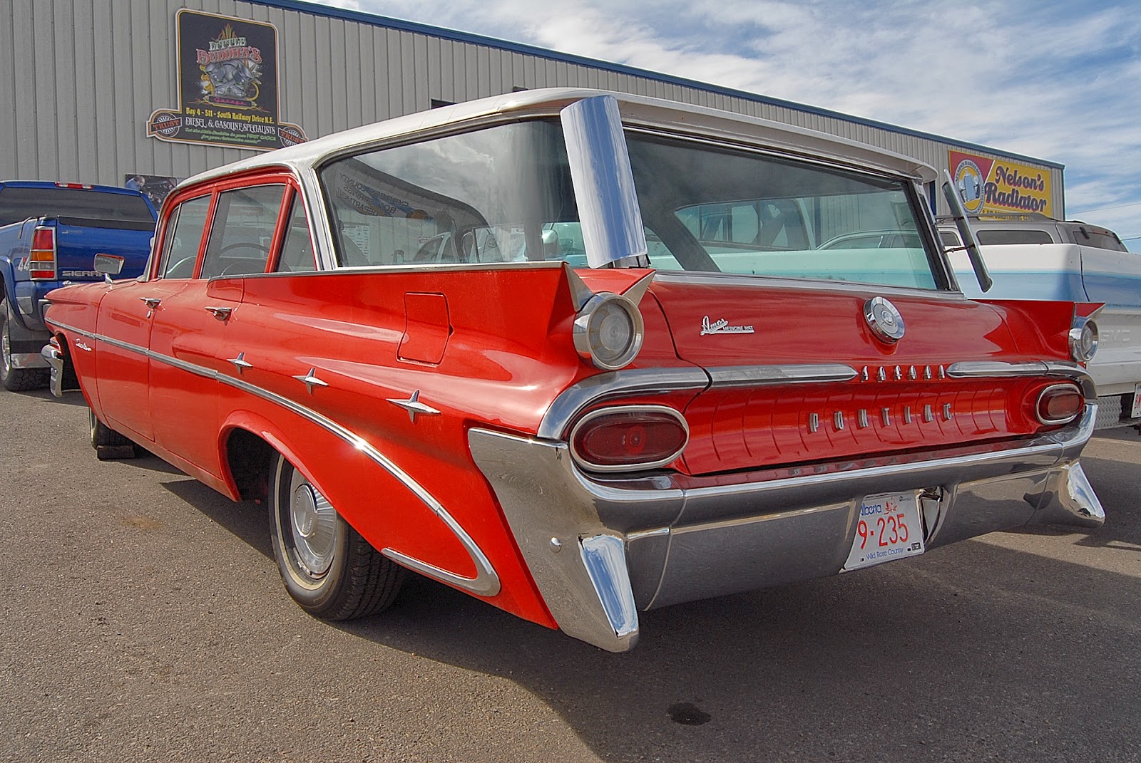 from Alex Emond: "This wagon was in Redcliff , Alberta , which is close to Medicine Hat . What can I say ... this is one outrageous car . I don't think I've seen a longer wagon . Drive past those "small car only" slots"--AE We've posted before about our peculiar interest in 1959 Pontiacs. You can find PB's essay on the subject by following this link: the essay, which has been a lot of places, was reprinted most recently in a Mexico City magazine, LITERAL, last summer. This wonderful wagon is a Canadian edition Pontiac, a Laurentian. In the US it was the year of Wide-Track Pontiacs--axles were stretched out a few inches longer and wheels pulled out to match the width of the body. But the Canadian Pontiacs of that era were actually Chevrolets with the wide Pontiac body bolted on, which meant their wheels were tucked inboard, ultimately kinda weird looking and unbalanced---the cars looked a bit like railroad boxcars teetering on narrow-gauge trucks.