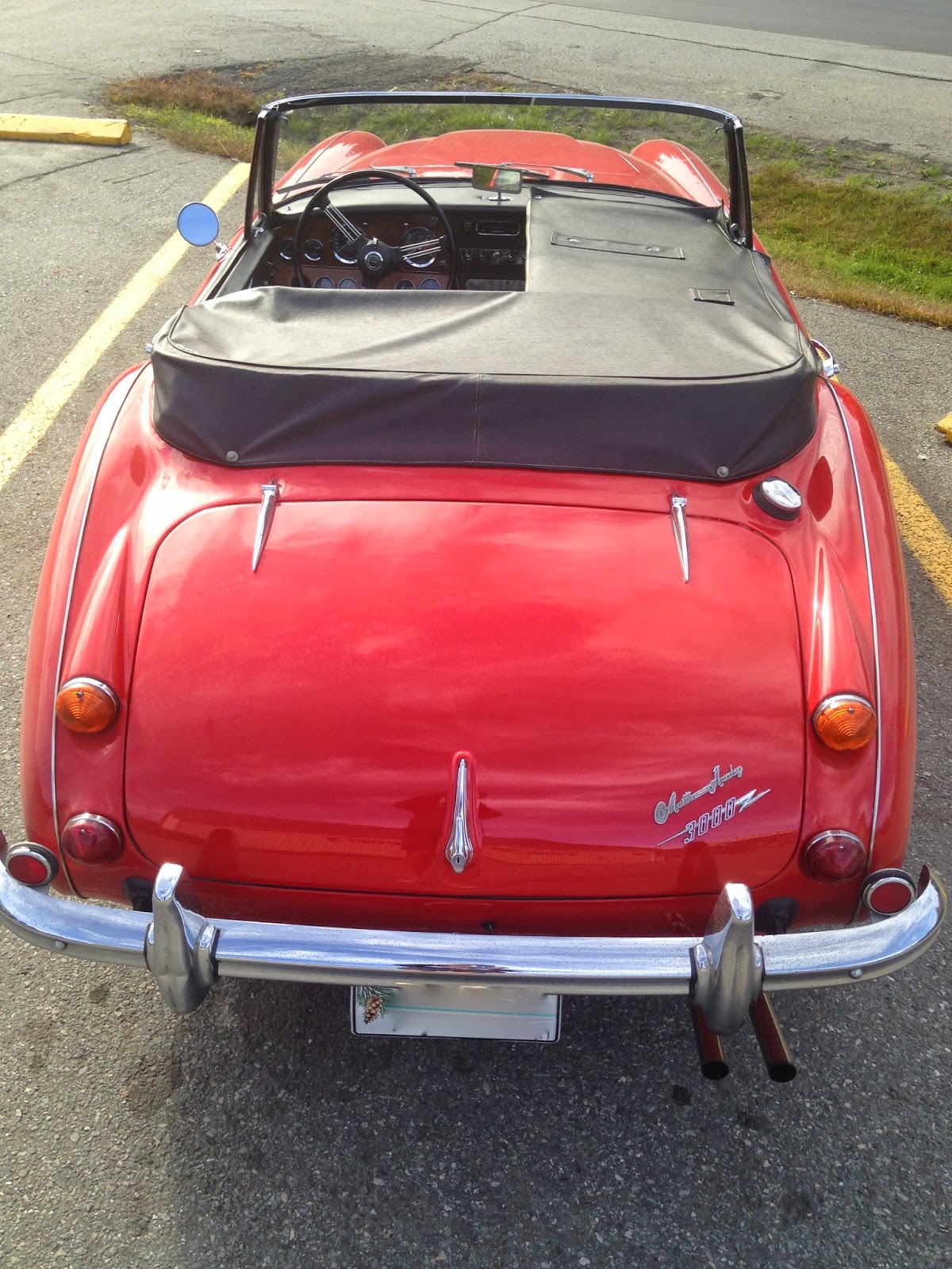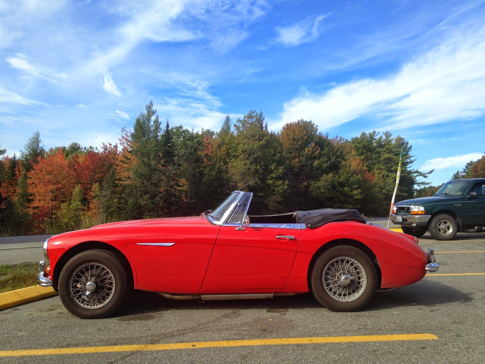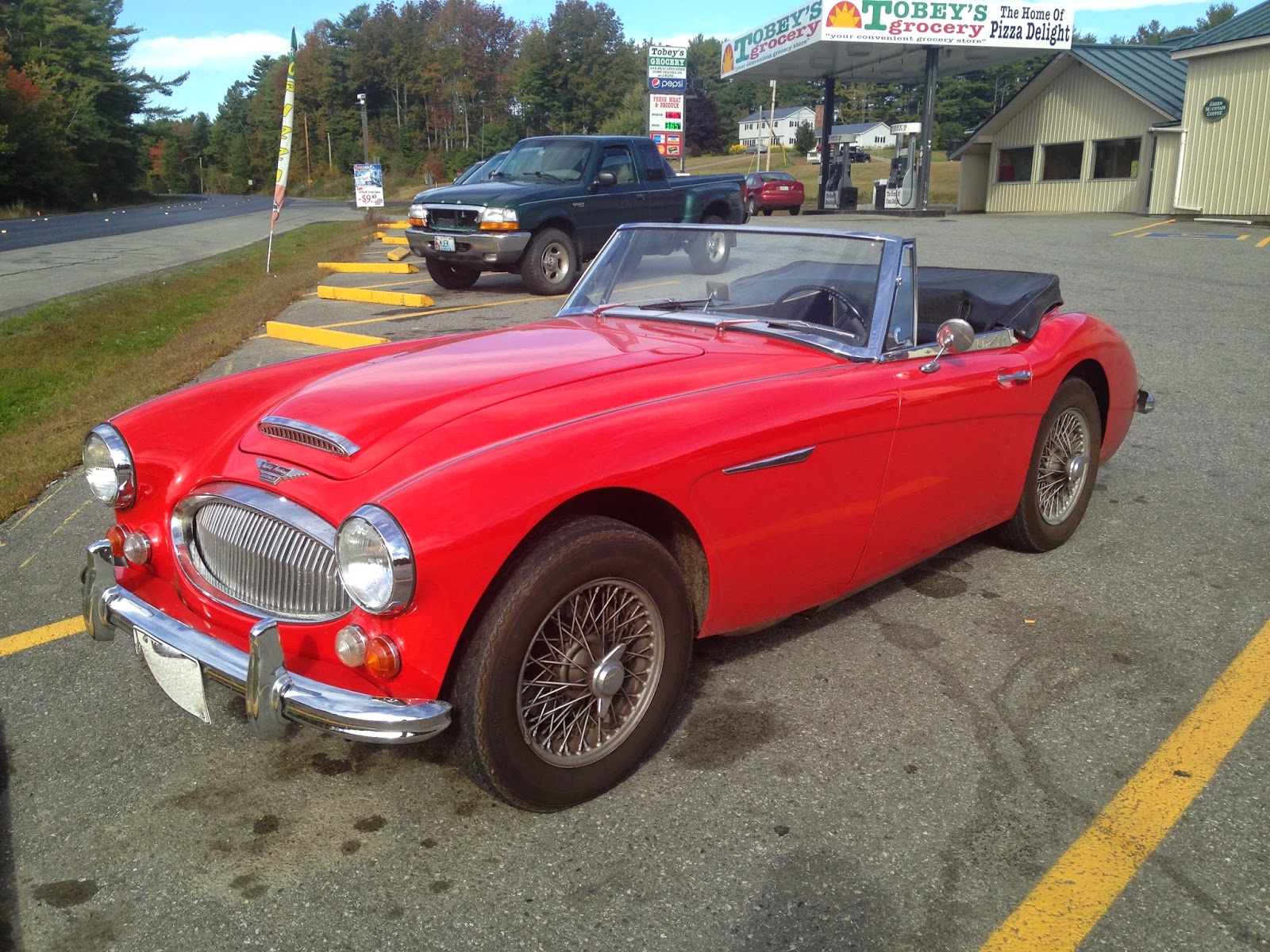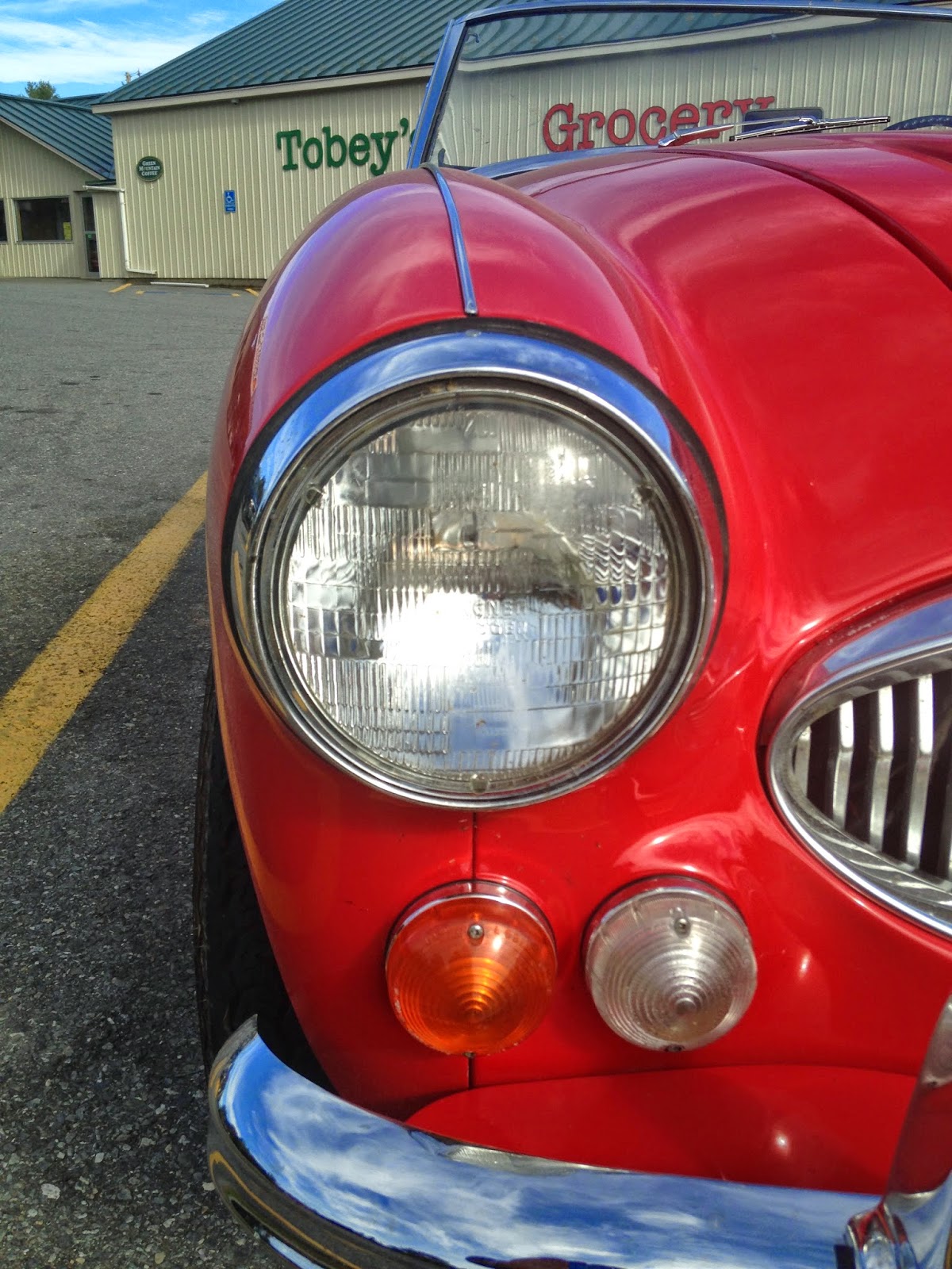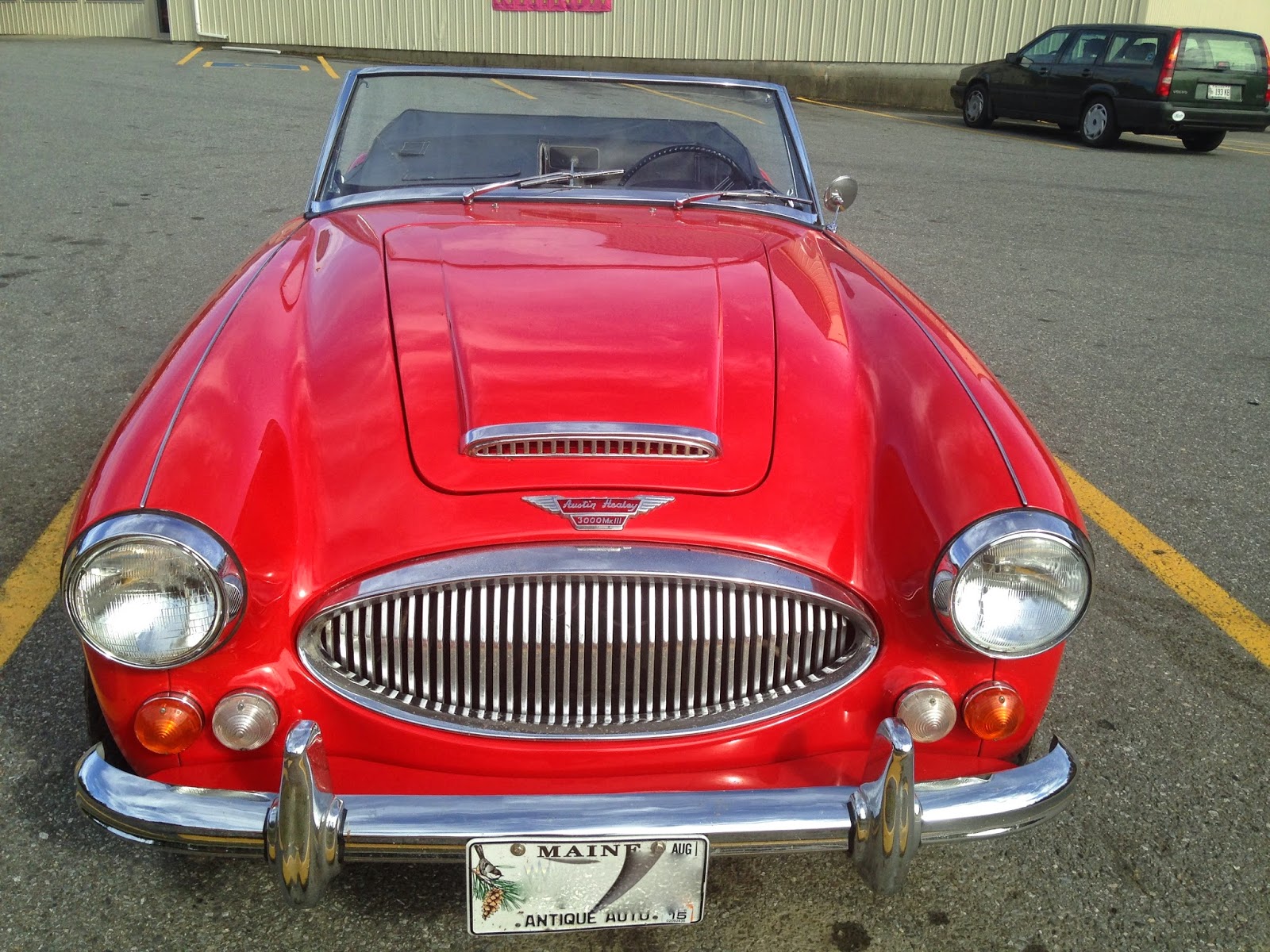 I was driving downeast on Route 3. Spotted this machine parked outside the grocery store in China, Maine, and had to turn around and come in for a closer look. Met the owner, an ex-air Force guy. Turns out this Healey is a one-owner car, and everything's original. It was repainted a few years back but the engine, interior--even the tonneau cover--are all as they came, straight from the factory (or should that be "the works"?) in '66. Last original Healey was this 1961 Austin-Healey on San Francisco Bay.Hey. Maybe you ought to subscribe to Autoliterate. It's easy to do---there's a tab to the right where you put in your email address to receive every day's post. Your email address won't go anywhere else, and we won't be trying to sell you any stuff. We're not that kind of operation.