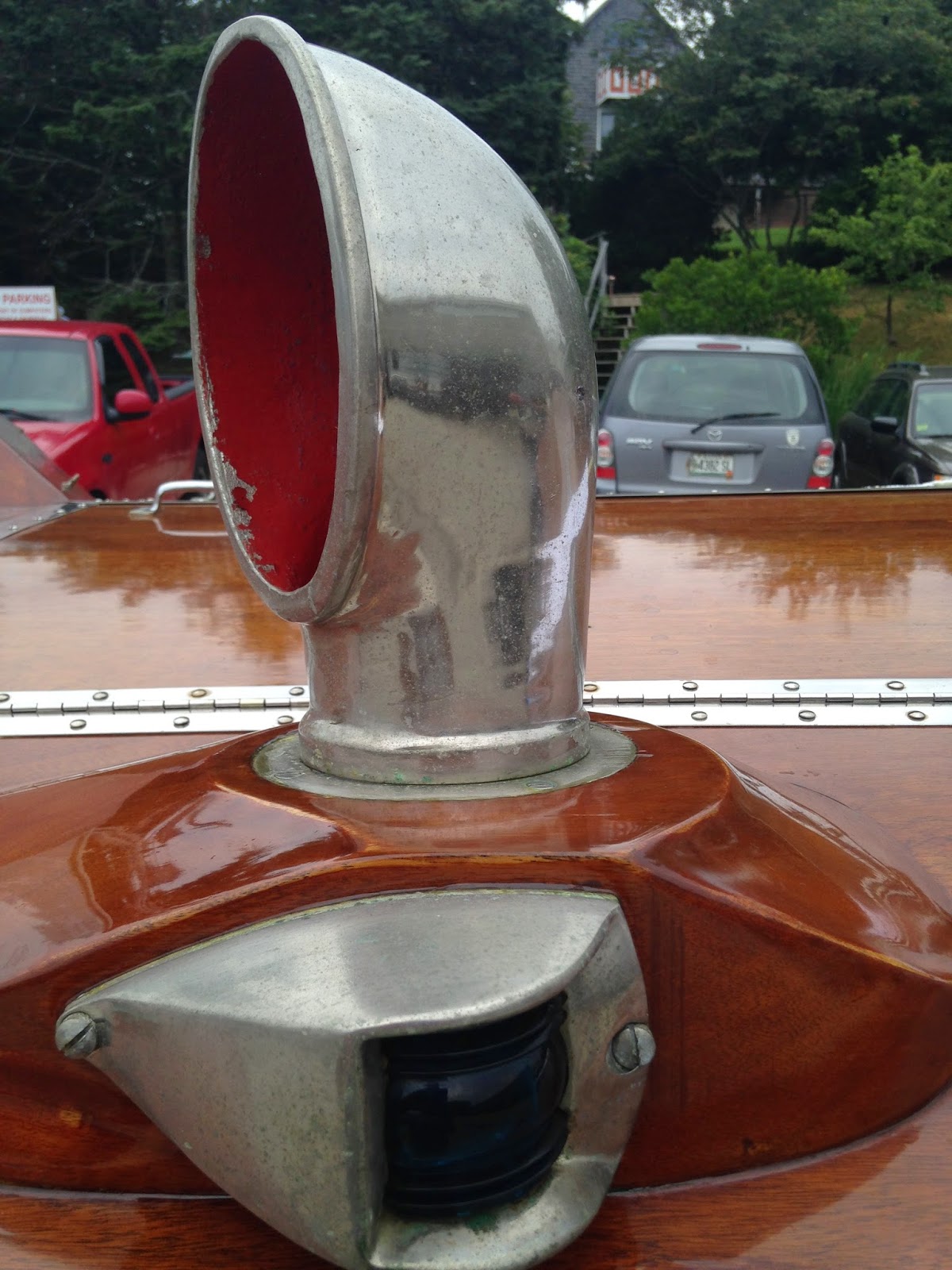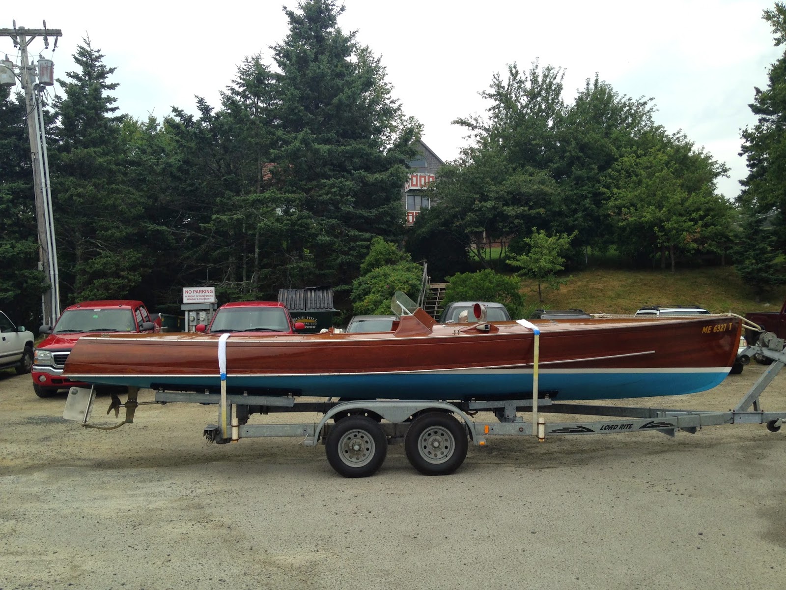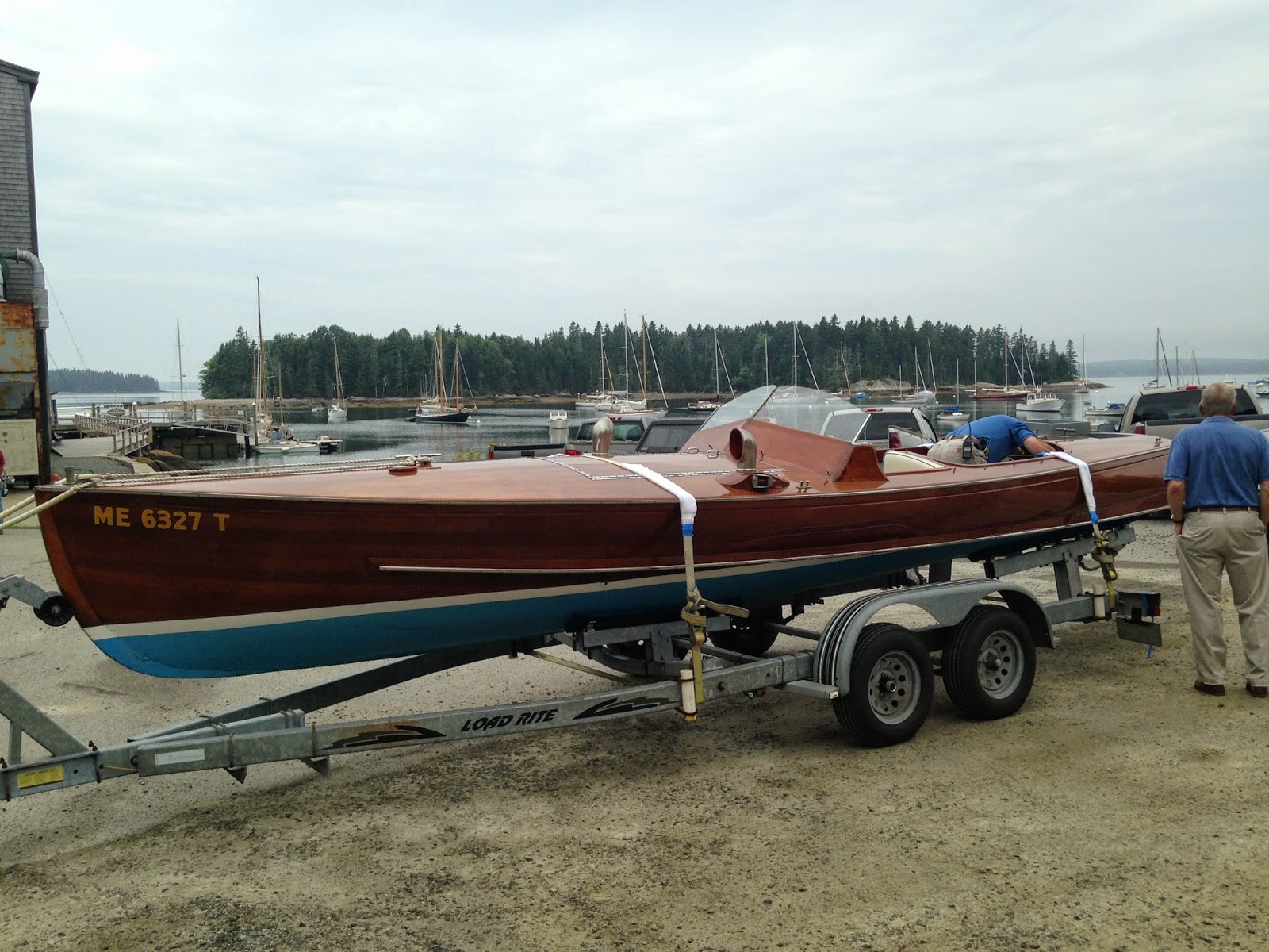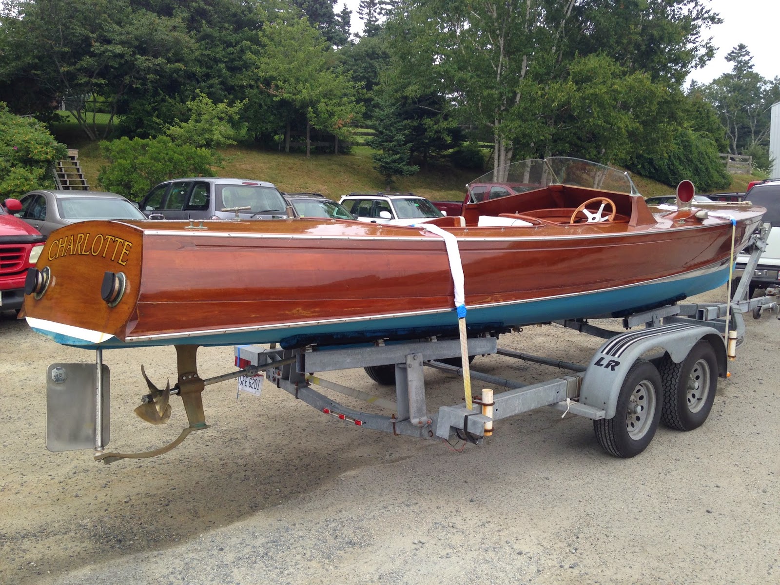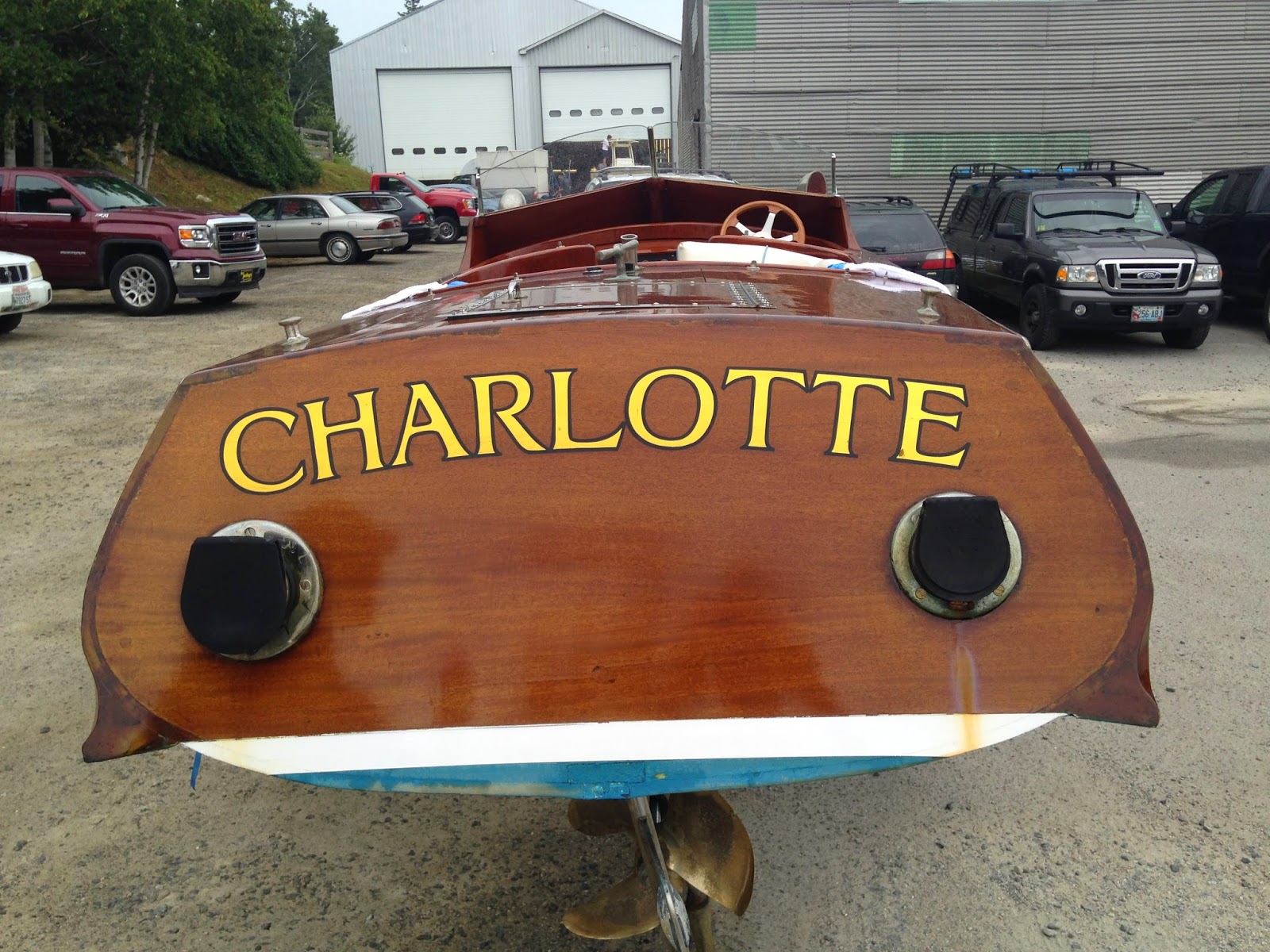 I caught Charlotte at the Brooklin Boatyard. I'd say she was built sometime in the Seventies as a replica of an earlier era of speedboat. An elegant thing.