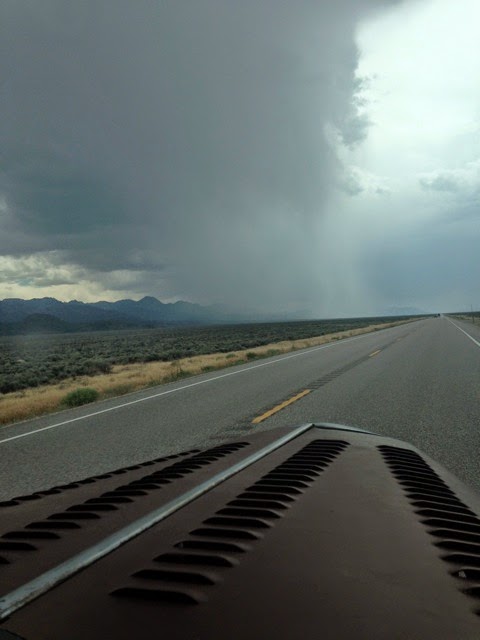 "...our recent Bonneville trip. Speed week was cancelled due to rain, the track... had 3 feet of water so no one ever touched the salt. Wendover was full of big trucks and trailers, race cars, etc. from everywhere, including Europe, Australia, New Zealand, the east coast, etc. Everyone had to pack up and go back home. "We left Wendover early Sunday heading for Tonopah on hiway 6, camping in the high desert out of Goldfield, Nev. We awoke to thunder at 1 AM, and watched the approaching storm from our tent. At 3 AM we got in the car, with lightning strikes all around us for the next two hours and huge thunder claps directly overhead. We later found a hot spring below Mammoth and camped in the rain near Lee Vining and headed home over Tioga Pass."The '34 Ford is a great magnet for social contact; at every stop we talked with bikers returning from Sturgis, truck drivers, people of all sorts. You don't get this kind of action traveling in a Toyota Camry!"