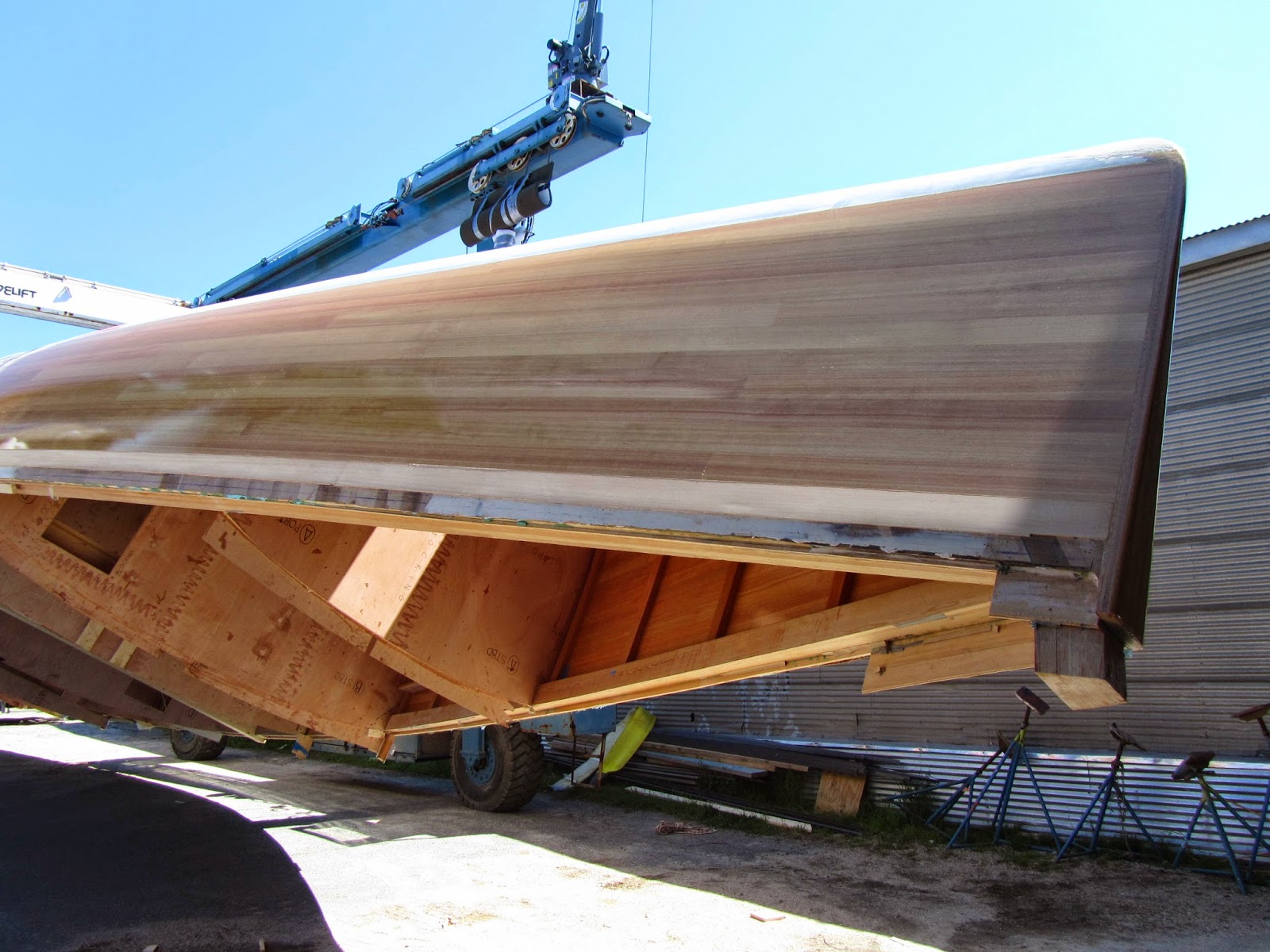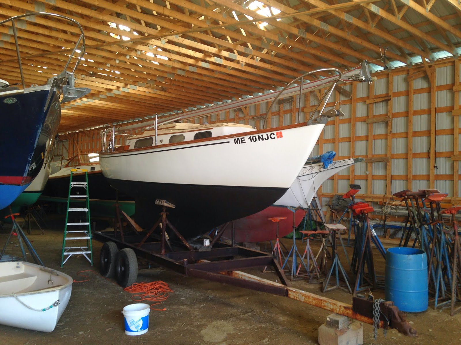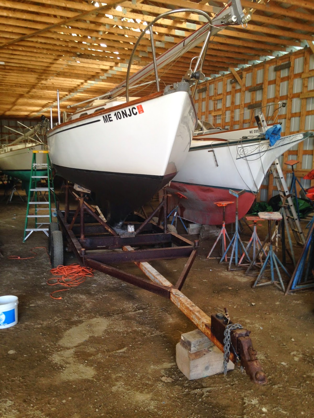 Scout getting ready to go in. Bottom paint, some topside, a coat of varnish. Motor tuned up. Need a patch on the keel and we're ready to go in, maybe Friday.