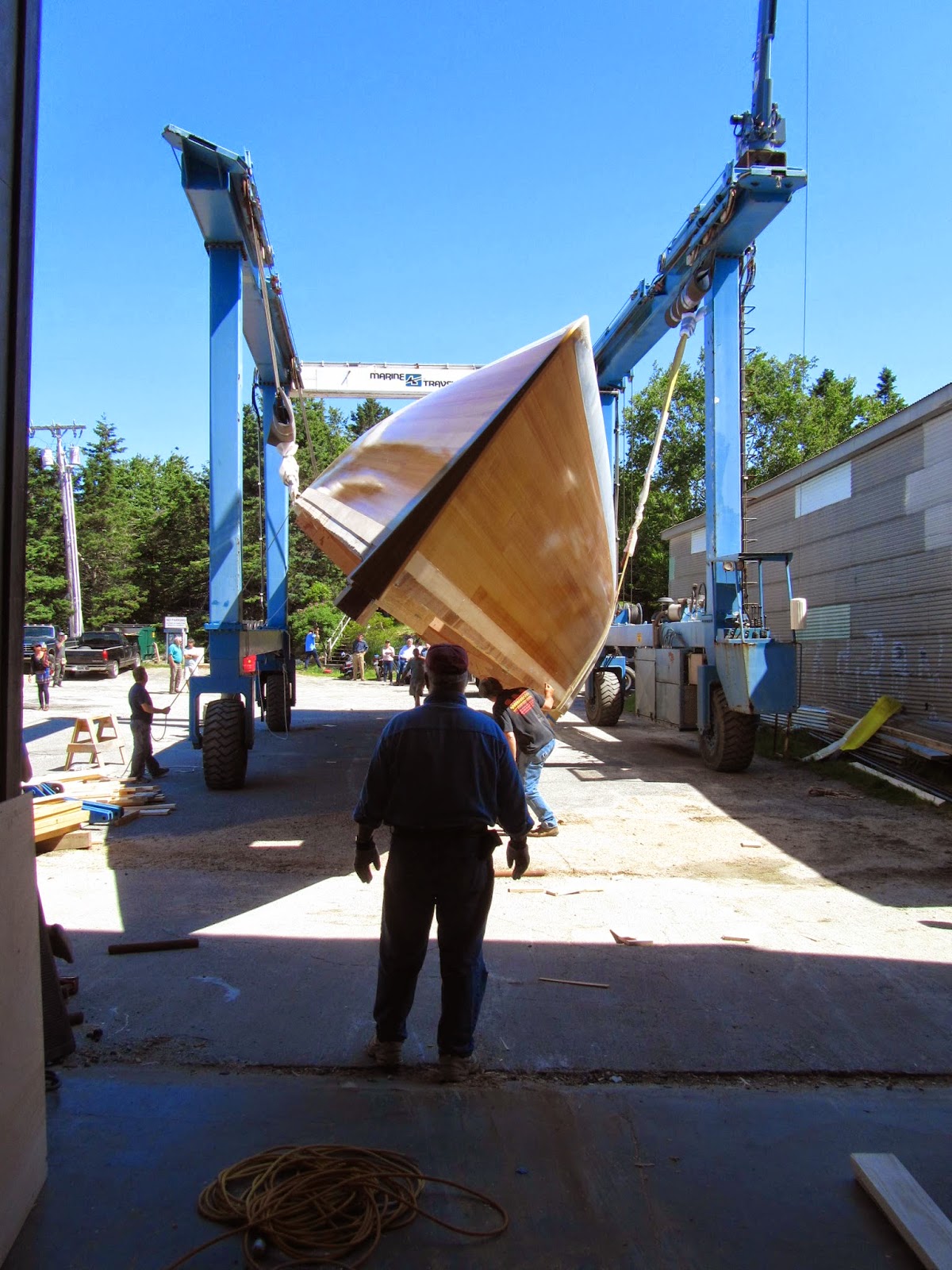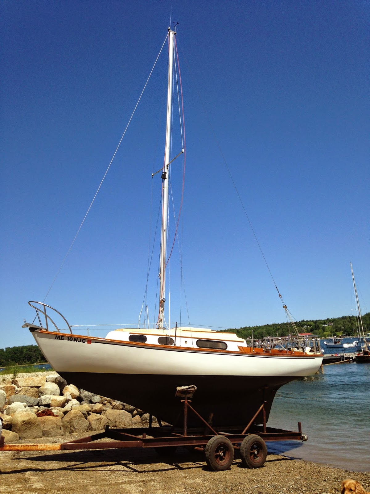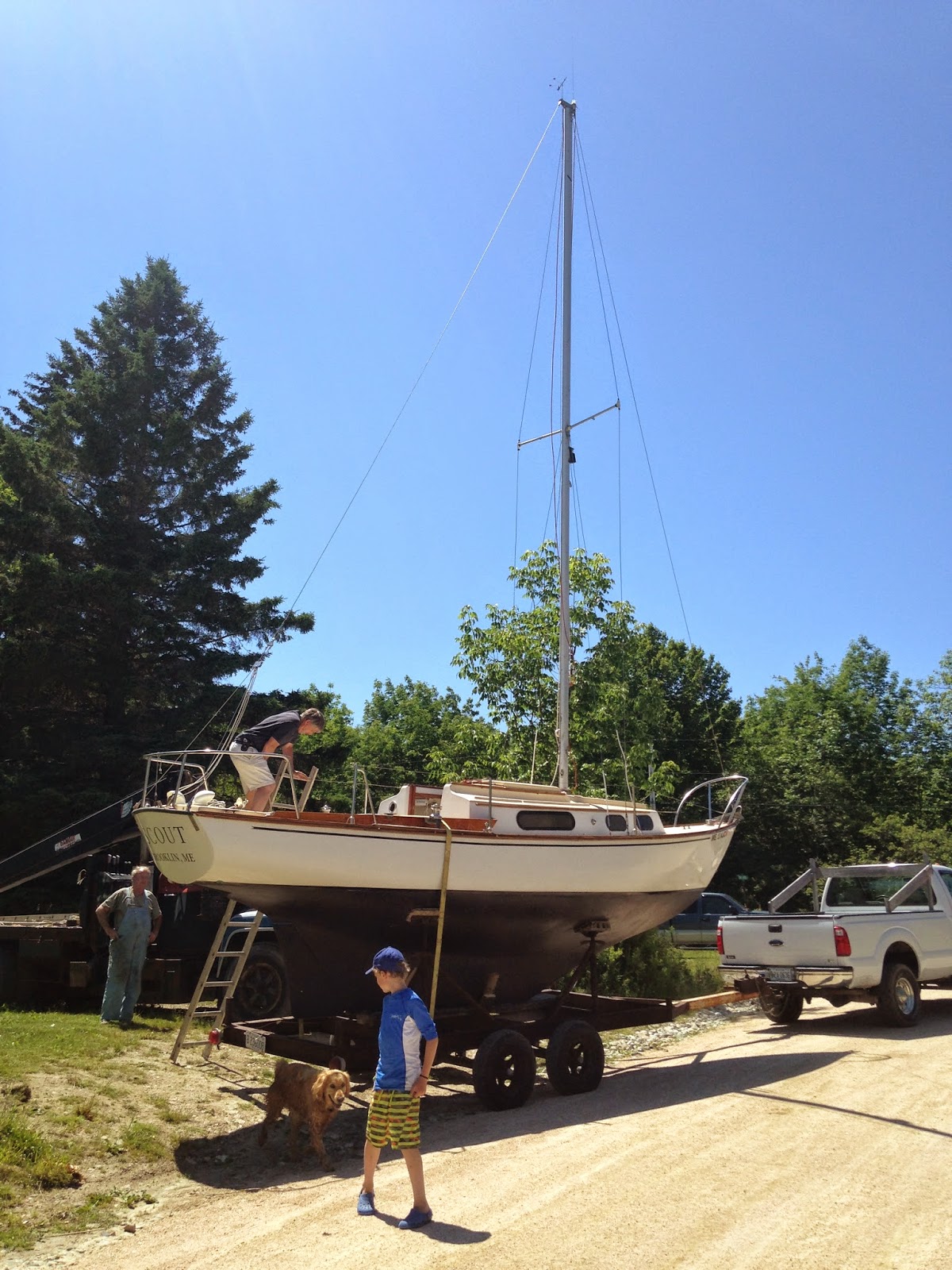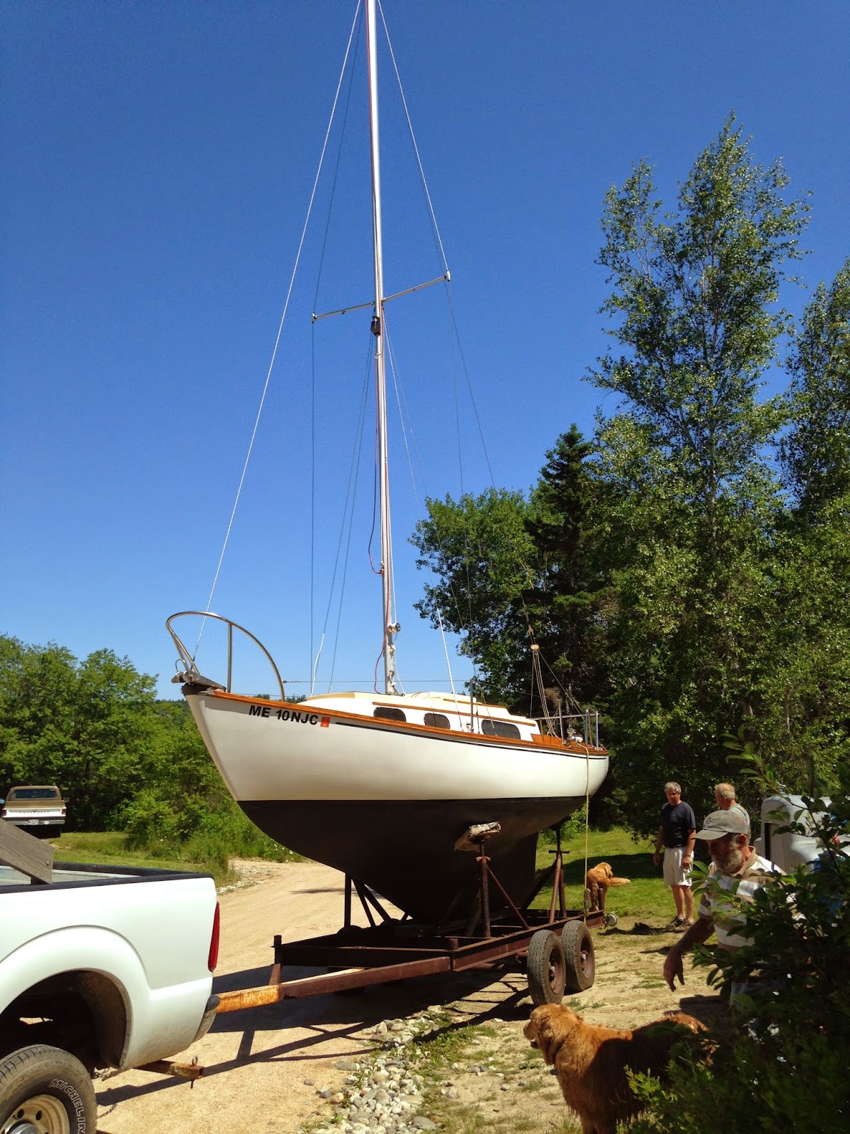 After a week of prep, Scout was launched at the Sedgwick Town Landing on the Benjamin River yesterday. Bill Grant in charge. I have been tuning rigging today, and various other chores. With any luck, we'll sail up Egeemoggin Reach to Center Harbor, and our mooring, tomorrow.