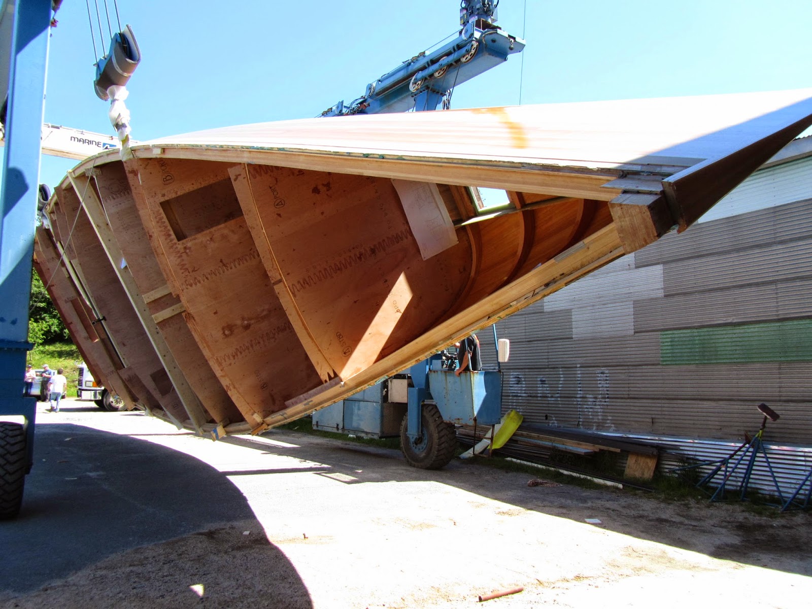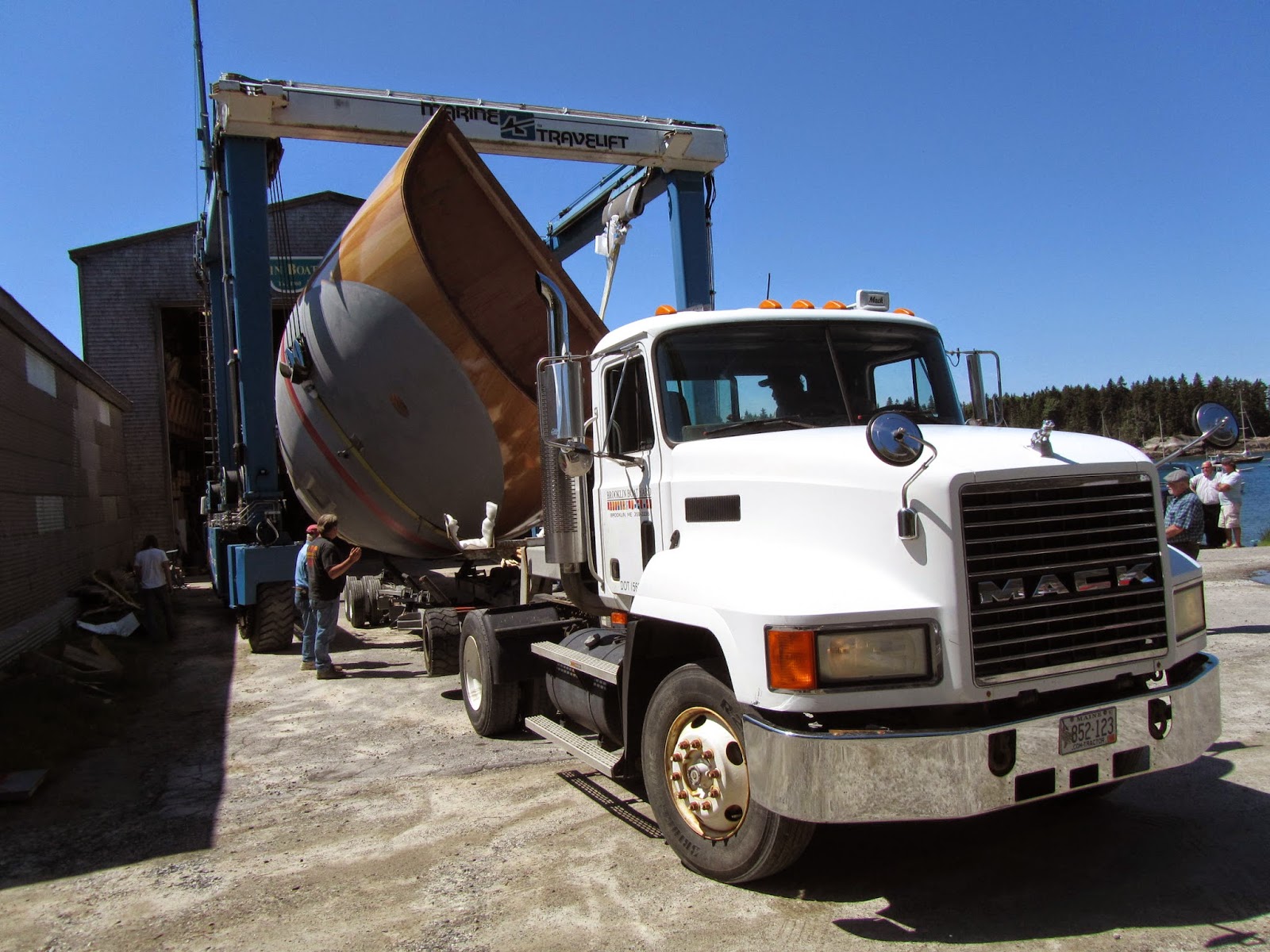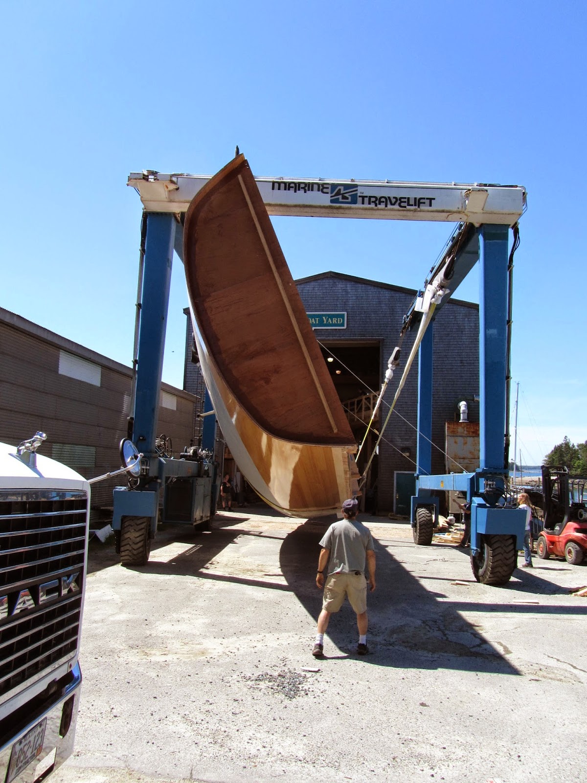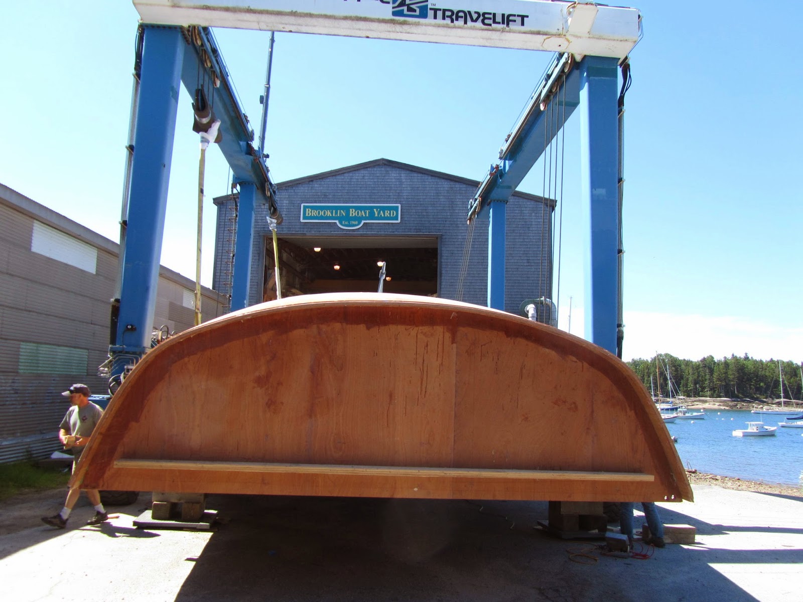 They are building a 70-foot Frank Gehry-designed sloop at the Brookin Boatyard. (Gehry designed the interior. See the windows, below.) Hulls that size are always built upside down, and at a certain point in the process they are flipped. Flipping a big boat is always a social event here in Brooklin, and on Friday it seemed half the town was down at the boatyard to watch. Slow motion fun. Launch date is a year from now.