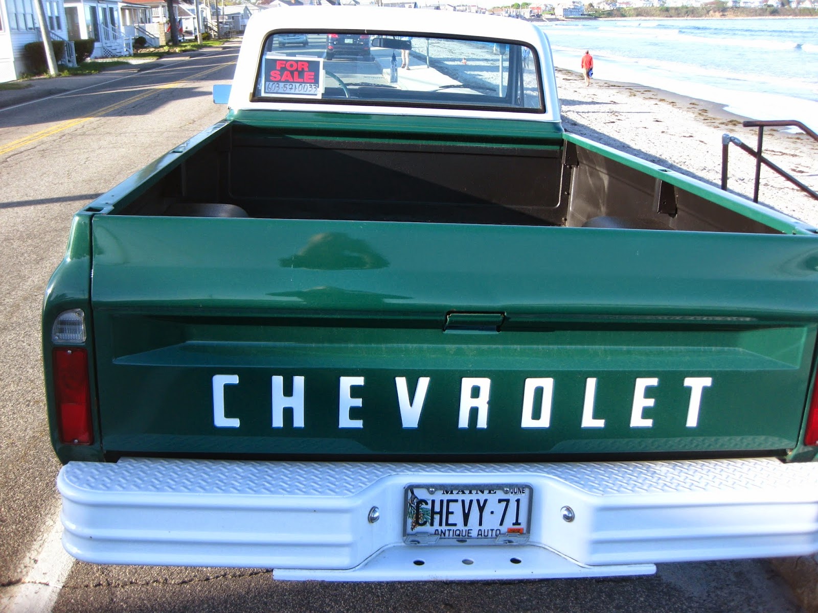 "Here are some photos of the 1971 Chevy Custom 10 pickup that Mary and I have seen each morning at York Beach. It may not be old enough for your blog, but I thought I'd let you judge. It's parked in the same spot each morning and it's for sale. It appears to be in immaculate condition. It'd be interesting to find out how much the owner wants. If you want to find out, his (or her?) phone number is on the "for sale" sign in the window (603) 571-0033.