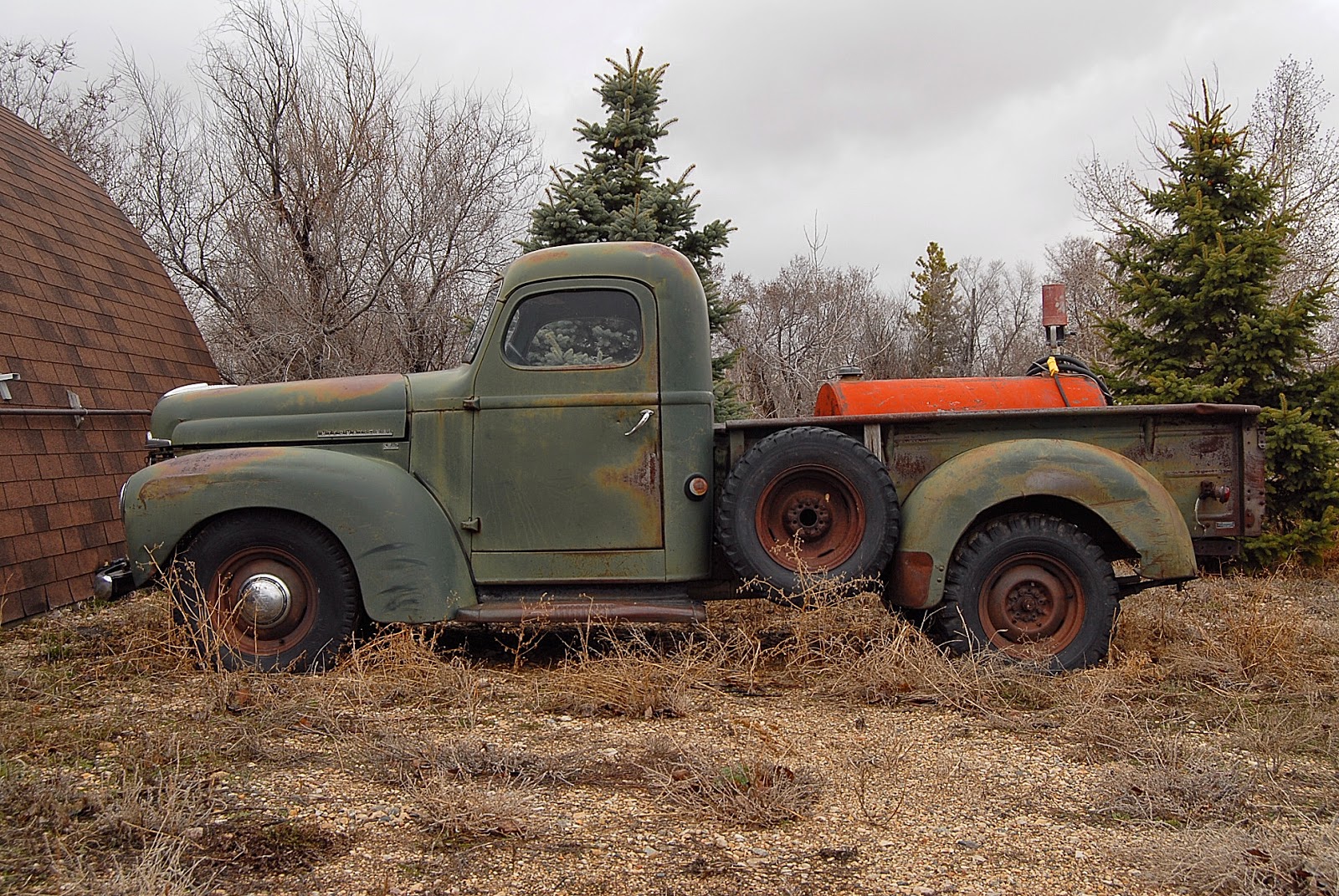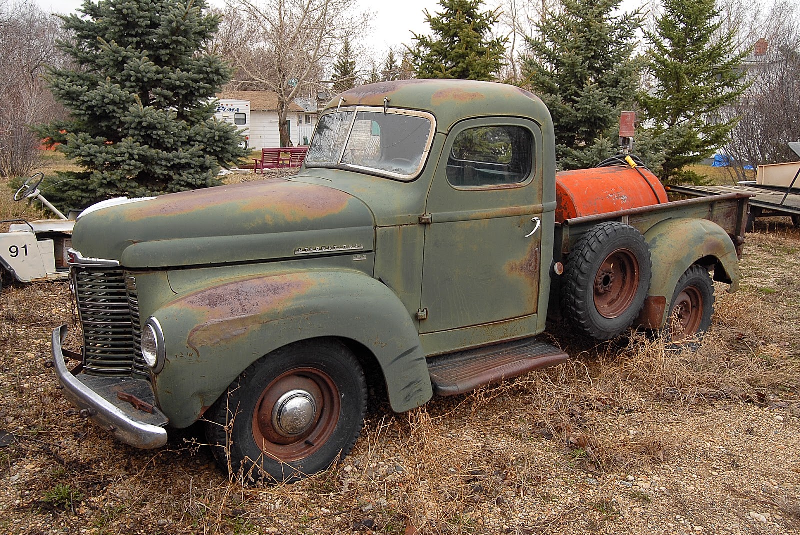 from Alex Emond: "This Green machine was hanging out in Lafleche , Saskatchewan. Looks to be from the mid 40's. I'm not sure if the windshield doesn't crank out. Built like a brick shithouse / Sherman tank. An International , let's say 1946. The war's over ... let's get back to work." --AE