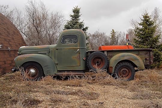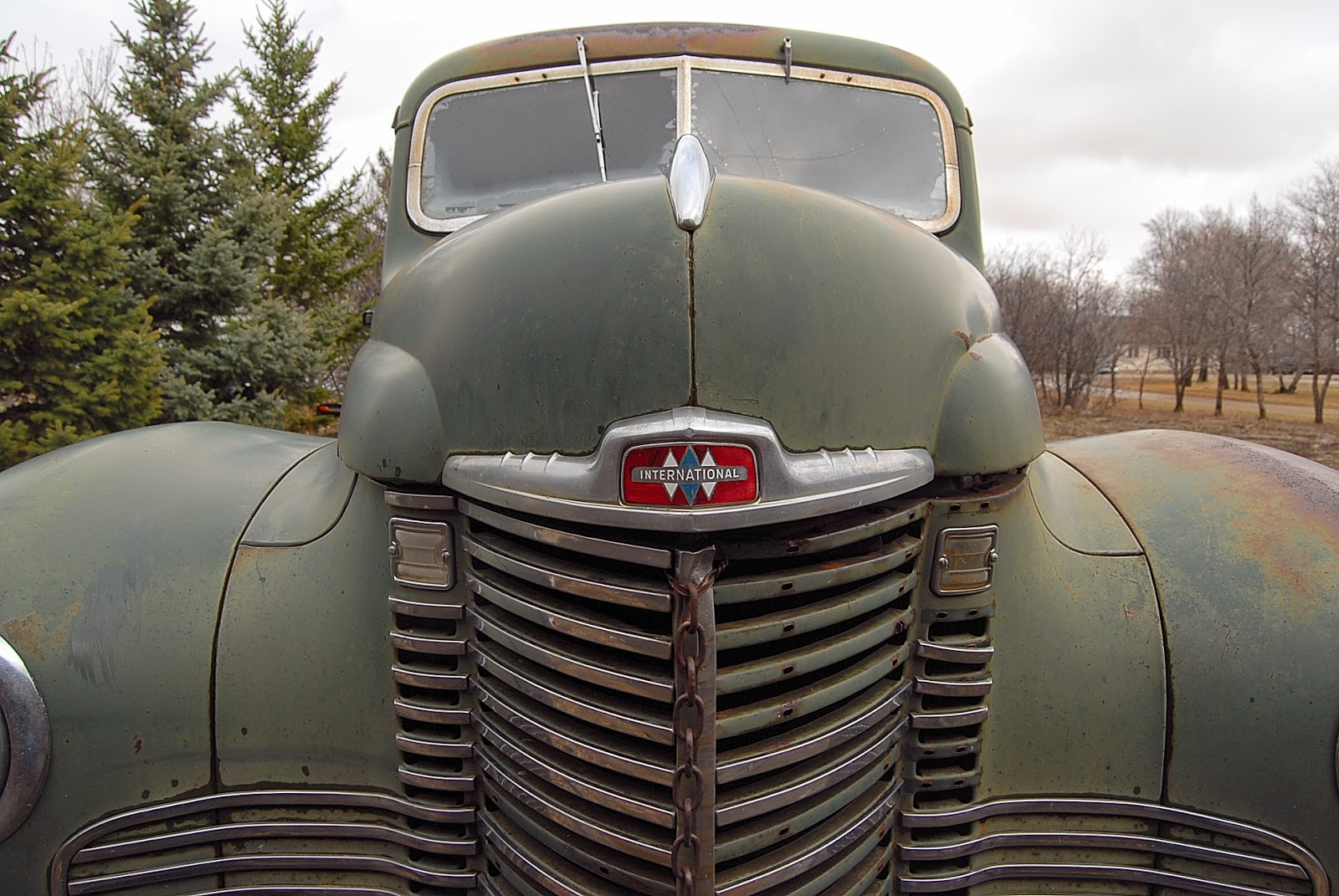 "This Green machine was hanging out in Lafleche, (The Arrow) Saskatchewan. Looks to be from the mid 40's . I'm not sure if the windshield doesn't crank out. Built like a brick shithouse / Sherman tank . An International, let's say 1946. The war's over ,eh?... let's get back to work ."--AE