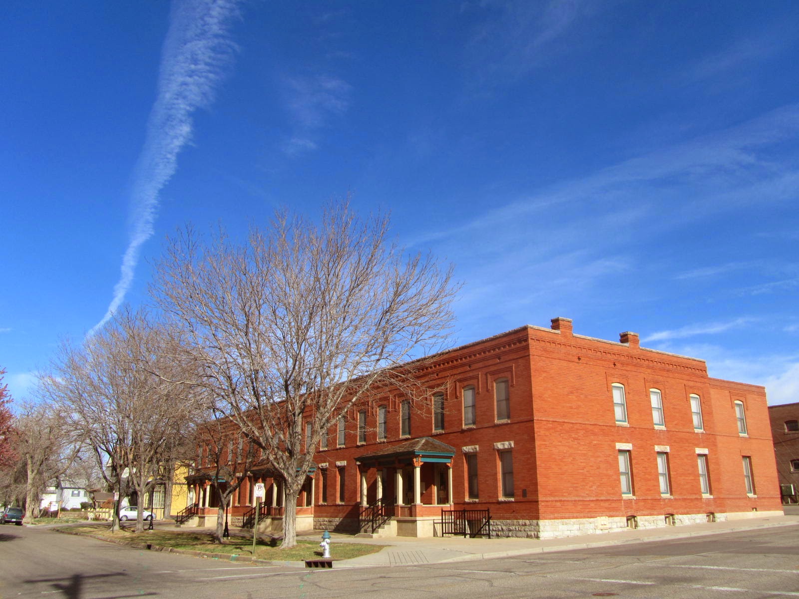 Pueblo used to be a hardworking steel mill town and, this being the West, the mills probably relied to a considerable extent on transient single males for labor. So in the older neighborhoods you see a variety of apartment buildings and rooming houses. The Fitch Terrace Apartments (below) were built in 1902. Reminded me of similar blocks same era, same function, in Montreal and, oddly, in Windsor, Vermont. In most of New England such building would be clapboard, and in any NE mill town the three-deckah would be ubiquitous. These buildings have dignity, don't they? Hard edges work well with that sharp Western light and big sky.