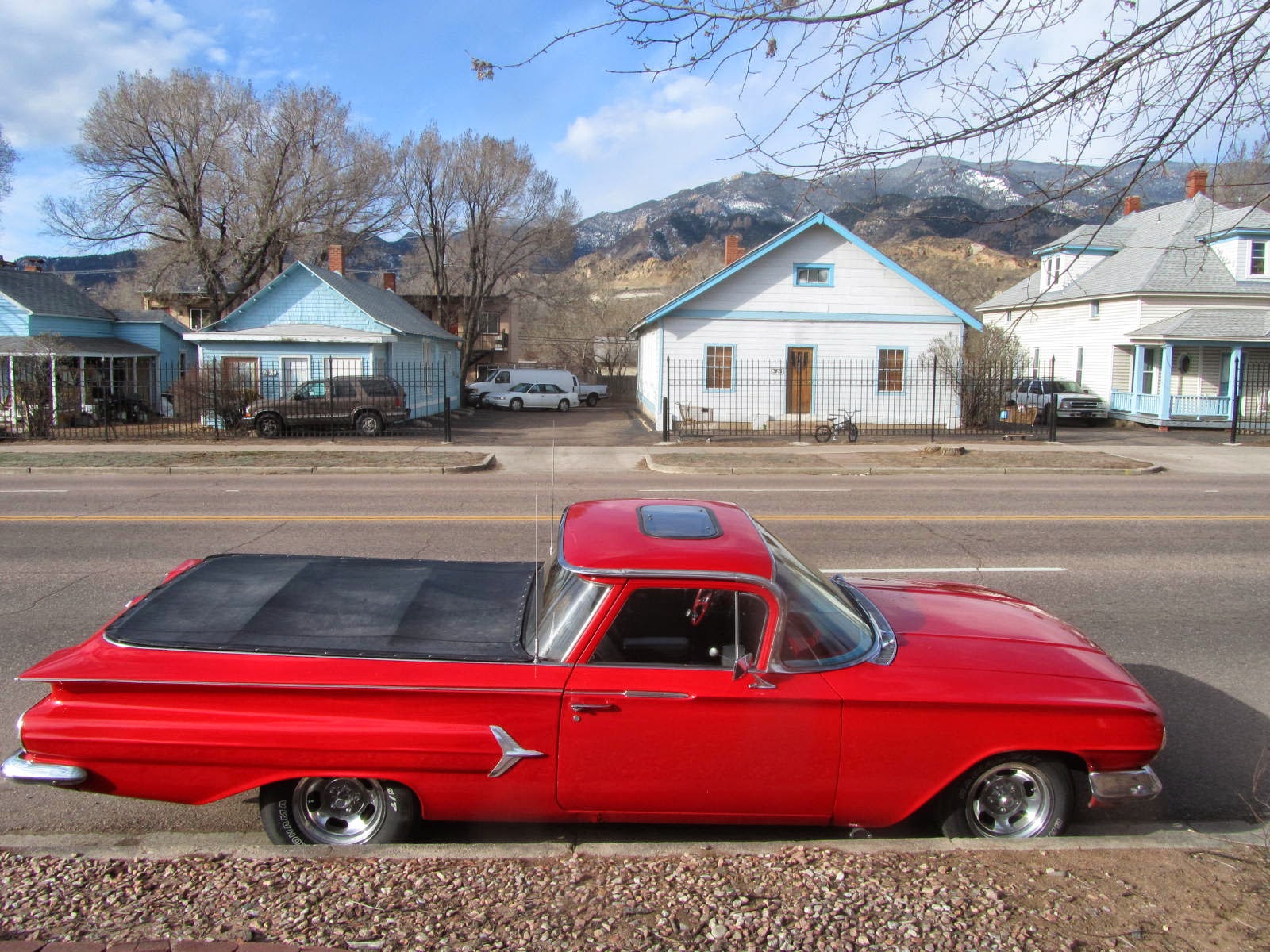 I met the El Camino on a Sunday morning in Colorado Springs. I was heading into my office at Colorado College to work on revisions of novel #3. It was bright morning. I knew I'd catch a cool car, and I did. I saw the EC on Colorado Boulevard, waved frantically, and the owner, Bob Fling, a car guy, was willing to pull over. He did the car himself, 17 years ago. Bob has a few more and I hope to see them.