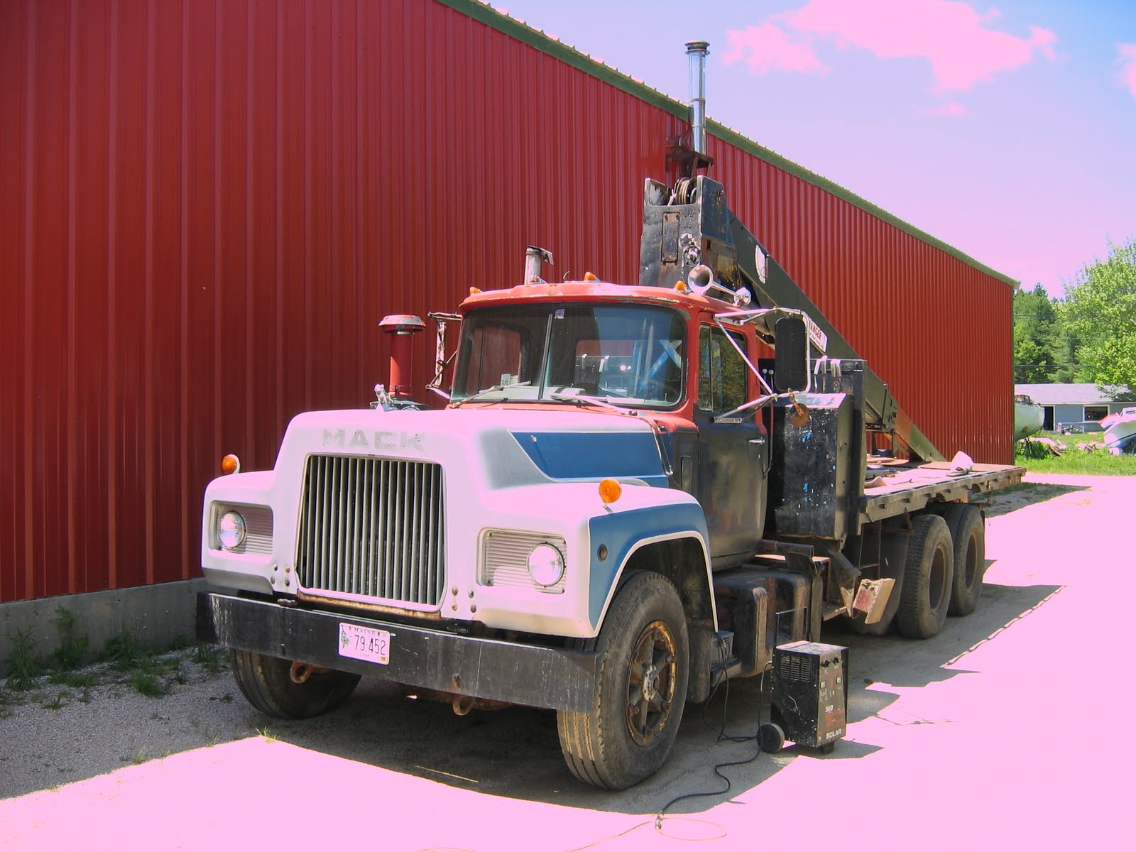 And, finally, Bill Grant's old workhorse of a Mack, getting its battery charged and ready for launch season. Bill uses the boom to step masts on sailboats launched at Sedgwick Town Landing. Hope he'll be stepping the mast on Scout this week.