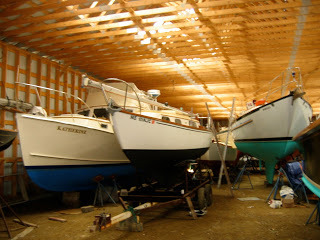 A shed full of sailboats can be a stunning aesthetic experience. Reminds me of the dinosaur room in the Museum of Natural History. It's all about scale. Even small boats are big, as objects go, and they seem even bigger out of the water, sitting on their keels, nimbly balanced with jackstands.