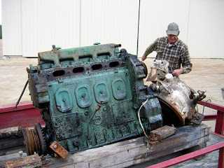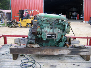 There's always something interesting going on at the boatyard. Here is what a Detroit Diesel engine looks like when she is pulled out of a lobster boat after 35 years of work. (The boat was Cheryl Allan, out of Deer Isle. A new(er) Detroit Diesel went in.) That's Bill Grant in the background, picking up the transmission with his forklift.