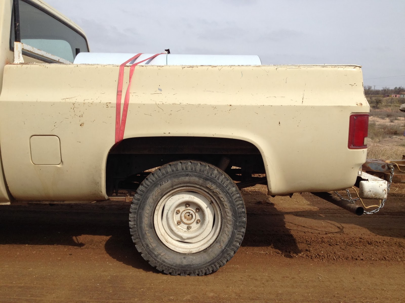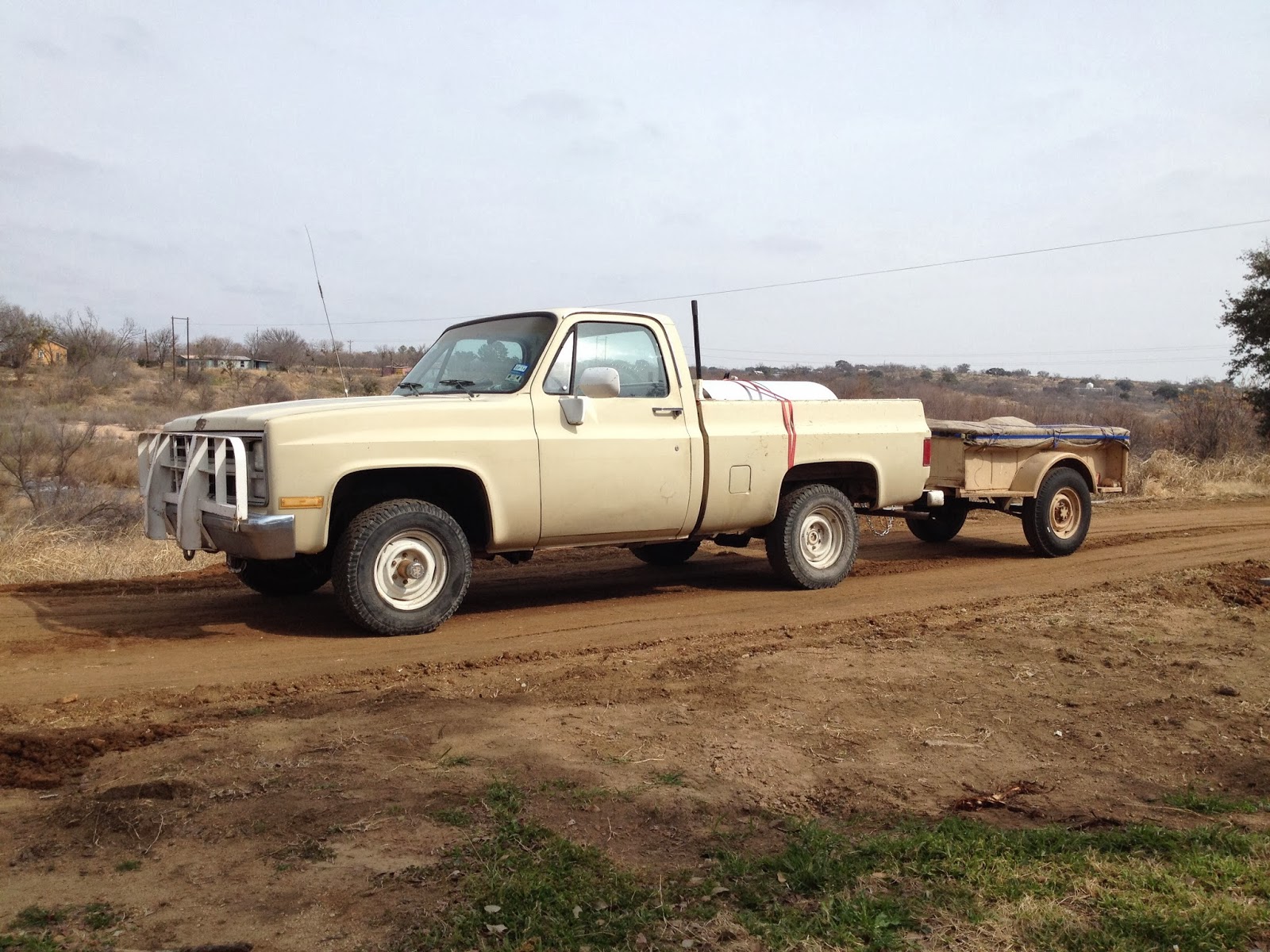 "So, the story on the K10 as I have it:"Bought from Bruce Matney, new owner of the former ABC Pump. He only had the truck for a year or so. Previously belonged to Robin Surber at Surber Ade and was driven by her, her kids, her dad and everyone else over there. Yes, servicing goats (not like that), delivering feed, round bales, etc. it has a Gooseneck hitch which seems funny given it's only a half-ton but it does have a 350 and a granny low. It's a manual which I vastly prefer. Now everyone has 1ton duramax diesel duallys for show goats and showing off. Robin says she's pulled many a stock trailer up a ranch road with that truck. At some point, Dennis Dickinson, gallery owner (2d) owned the truck and loves it still. It has twin pipes and a billet shifter. Otherwise it is almost as far from his gloss black and tuned Firebird as you can get and still be driving an American car... He waves at me all the time. Before him the truck was owned by Manny Lujan who ran a service station on the corner of Austin st and hwy 90 for years. Manny recently died so I haven't had the chance to ask him about his history with it. Not sure if it came from Pierce Motors. It is not badged nor is the bumper. It has been painted at least once in the original color. I meant to ask robin if she put all the towing equipment on it or if it came that way. Neither Robin, Bruce, or Dennis took it out of the area. She's pretty worn in but by no means worn out. It's funny, she's totally stock, but looks a little squat to me. Maybe the "soft ride" package makes her sit low that way, perhaps the springs are just tired. If I could find some 6 lug 16" rims I think she'd look better. Might give her a bit of a "rubber overdrive" too cause top cruising speed is 60-65. Though I have had the speedo pegged at 85, just to find out! It felt great to stretch her out on the road and really work wonderfully the whole time. Traveling with a vehicle is really the best way to become attached. "--DB
