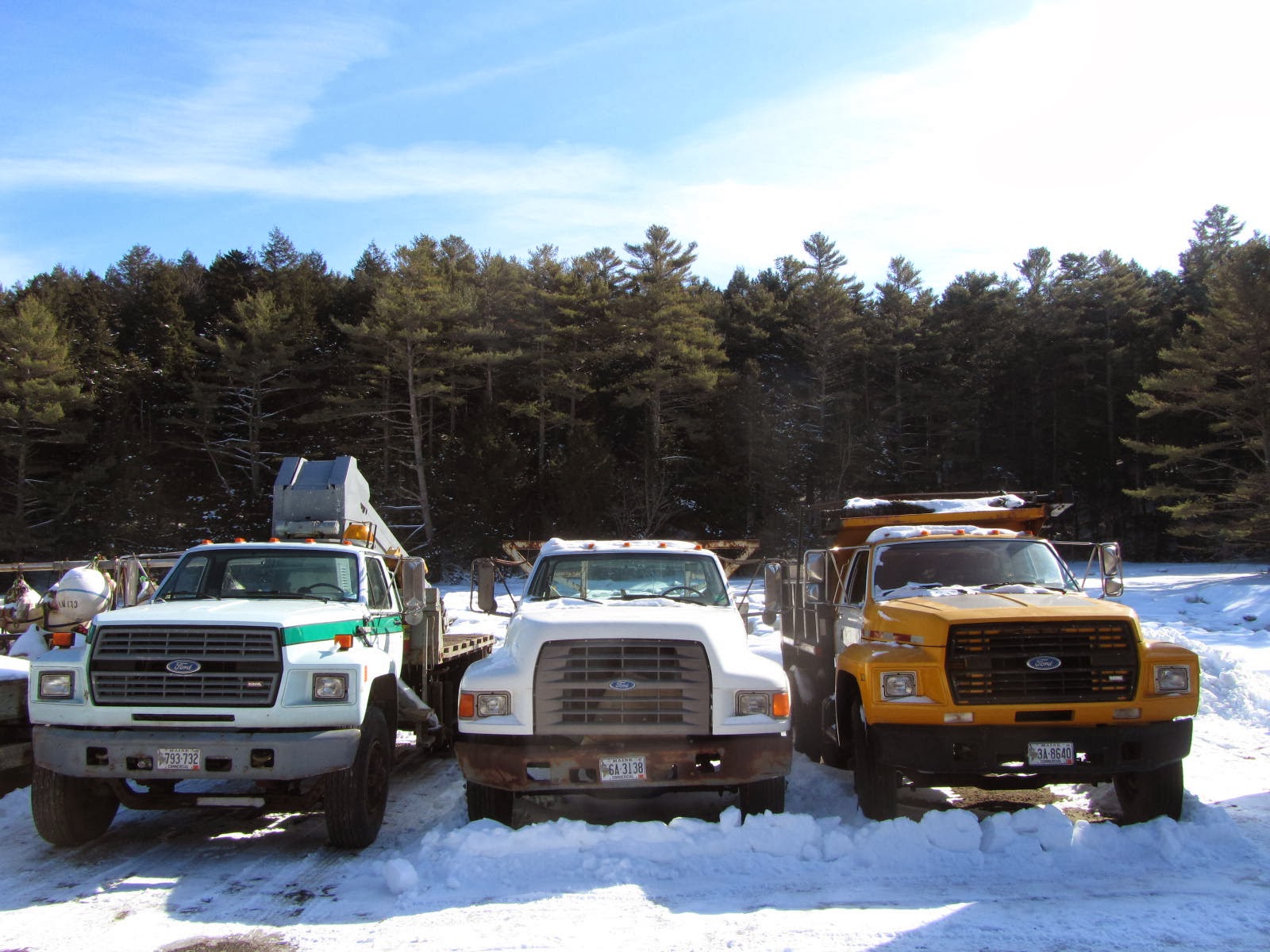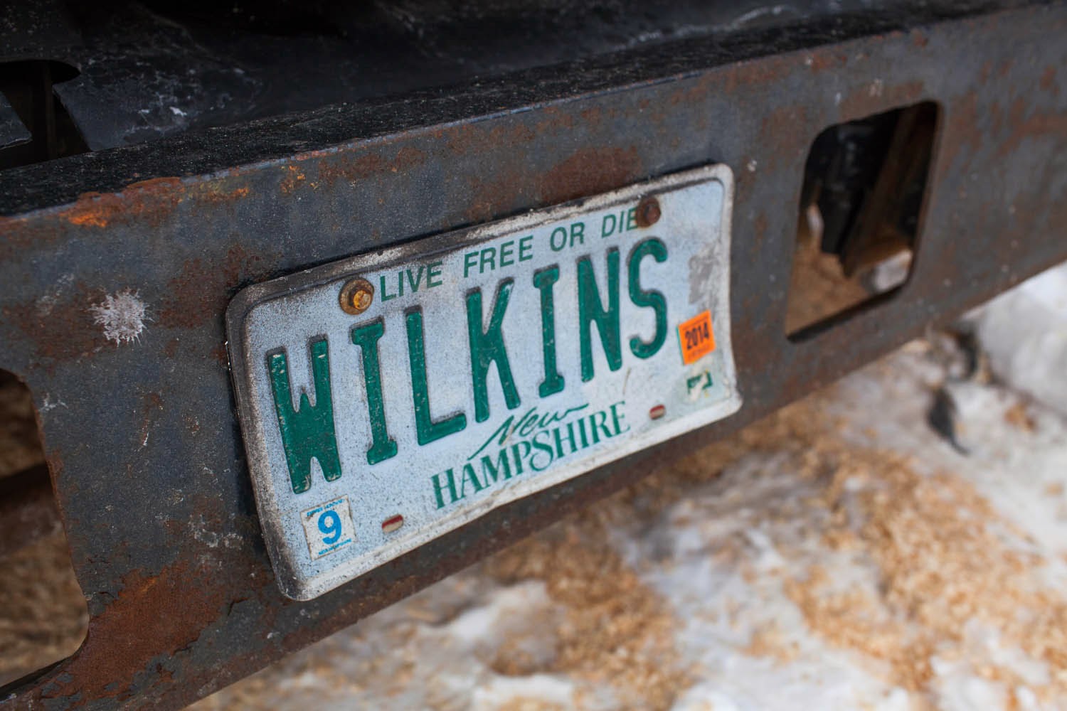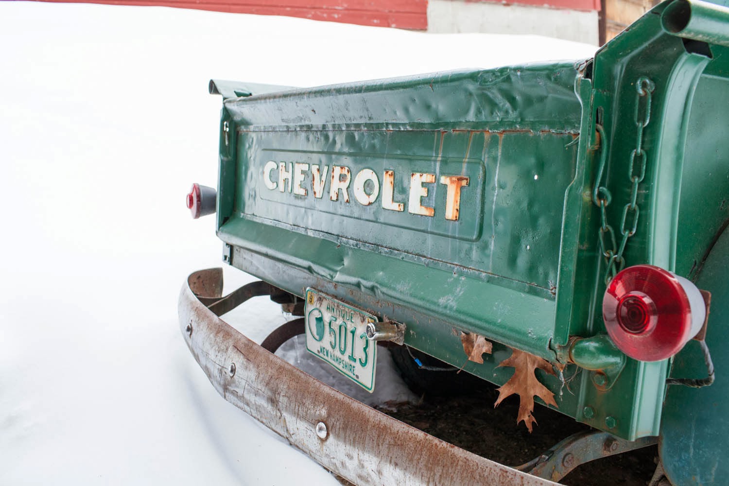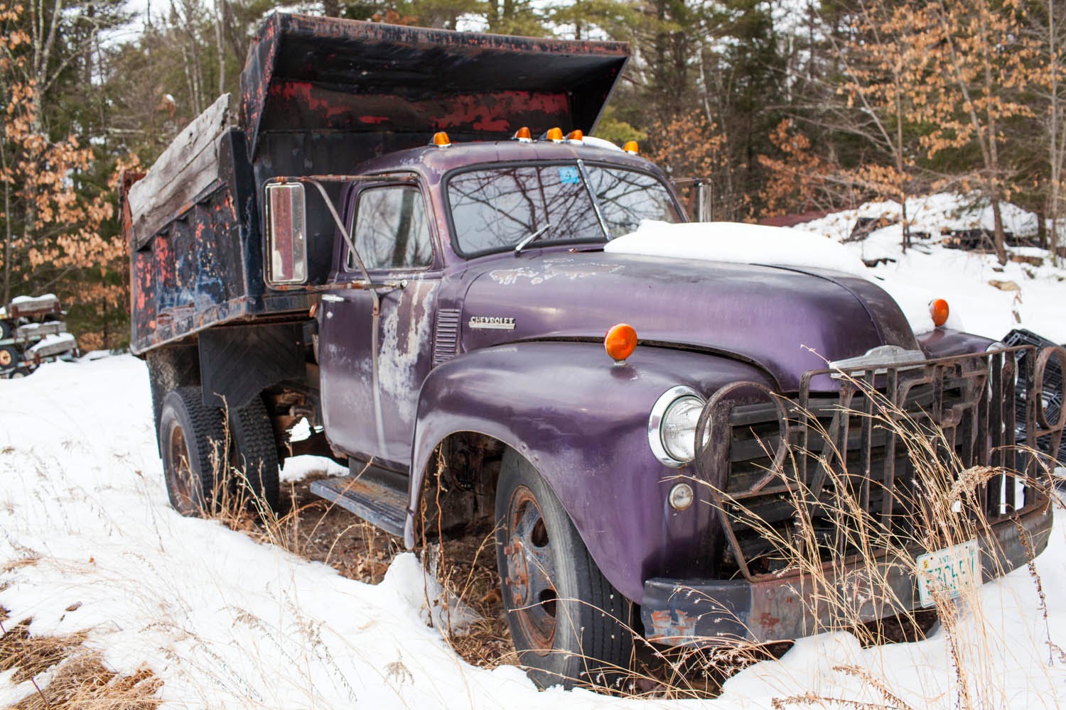 from Jarrod McCabe:"Both trucks here are owned by Tom Wilkins, owner of Wilkins Lumber in Milford, NH. Tom is an 8th consecutive generation sawmill operator in NH."First up, a 1953 3100. he's been driving her recently as noted by the inspection which is due this year. apparently NH runs inspections on registered antiques bi-annually and they're always up for renewal in the month of April - presumably when everyone's pulling them out of the garage."Second, a 1953 6100 - a two-ton dump truck. this was Tom's daily driver for years. he gave her up a few years back for a much newer big Chevy dumper. the last season he ran the '53 both wheels fell off from the treacherous frost heaves of NH and he got frostbite on his toes from the truck's lack of heat. it wasn't the first year he'd had frostbitten toes. for his new truck, the 4500, he had them match the metallic purple. he told me it was good advertising. assessing the wear on the bench seat, it seems his only companion was that fire extinguisher."--JM