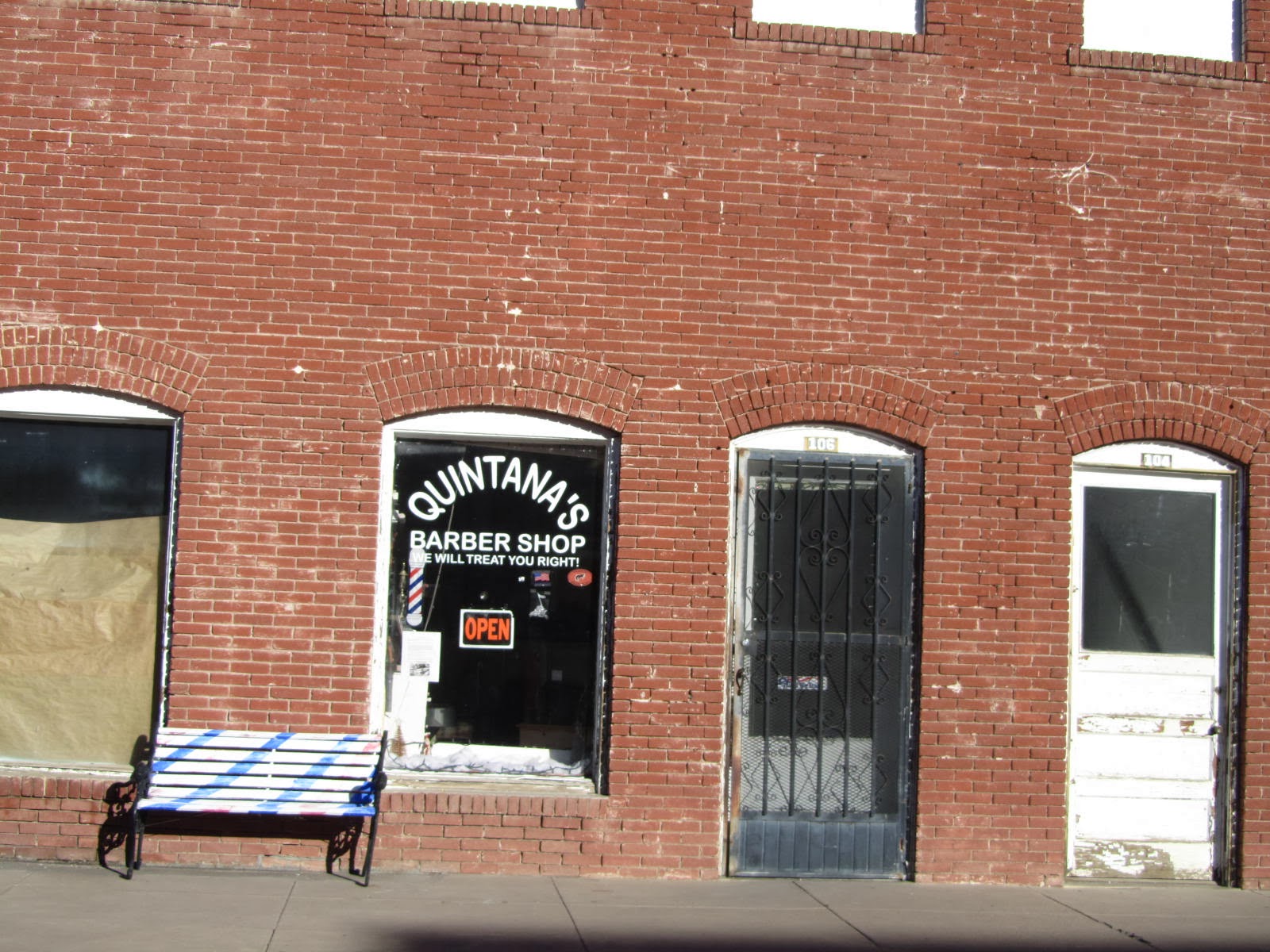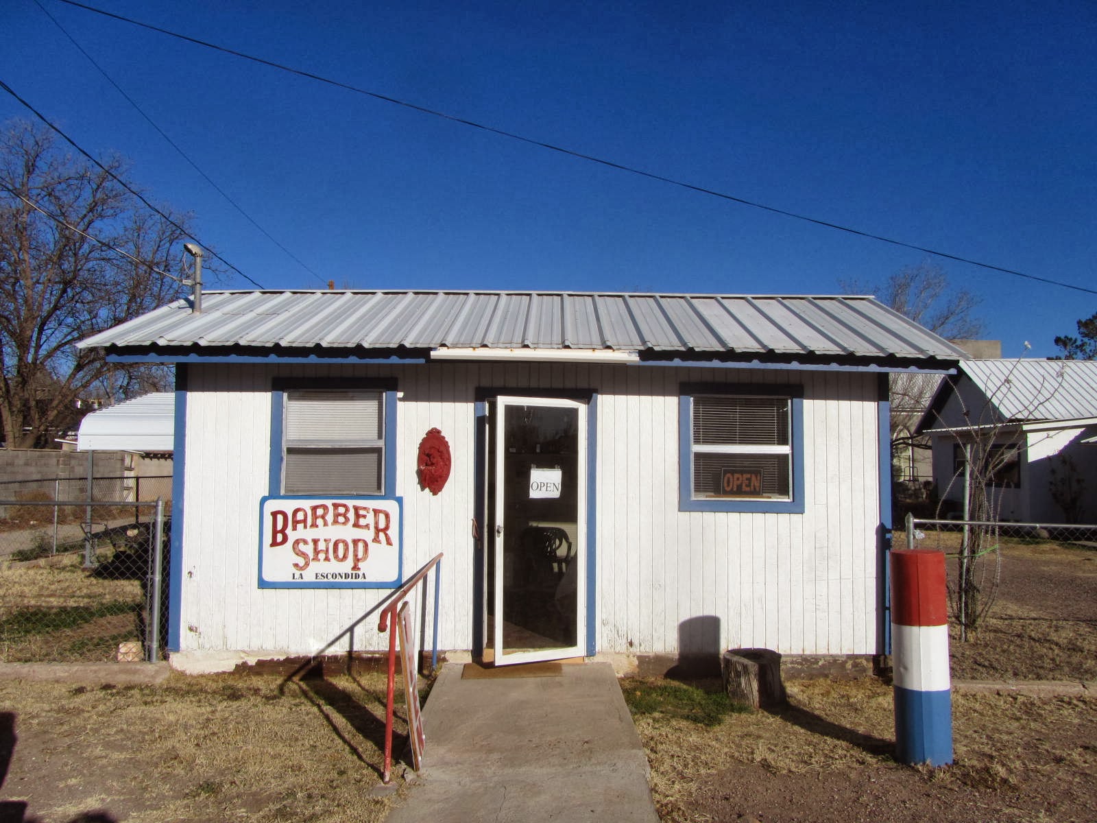 Two great barbershops in town. One barber is the former sheriff of Presidio County. Hey, John Wayne was the sheriff of Presidio County in Rio Bravo. Wonder who cut Ricky Nelson's hair ? Oiled it, more likely. Anyway, at either of these shops, it doesn't matter what you ask for. You get el haircut. Suits me fine.