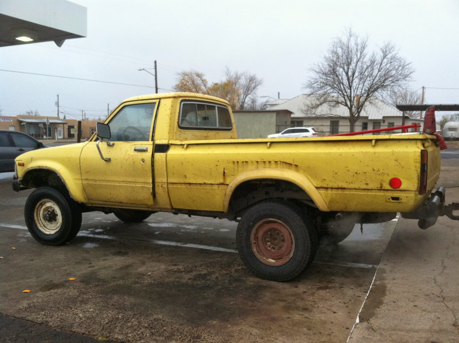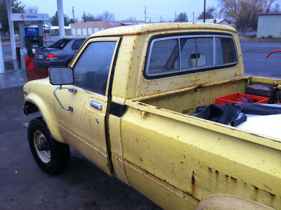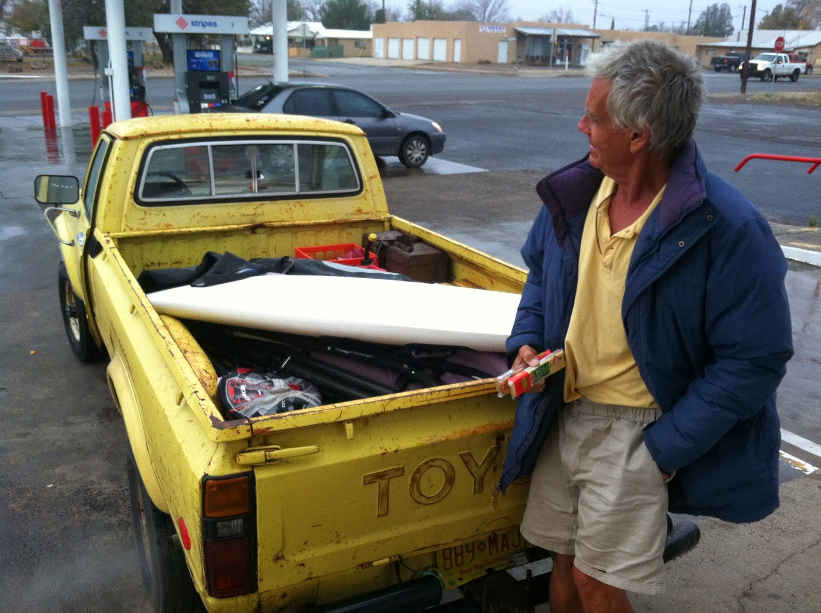 "I'm super partial to these old Toyotas. In fact, I own a 1980 myself. This fellow was driving thru Marfa during an ice storm. I followed him to the Stripes, where he bought cheese nabs and a water. Left the truck idling (amazingly well) in the lot, windsurfer in the back. Shorts, polo, anorak. New Mexico tags Cool fellow, short on words. Had the truck since 1982."--DB