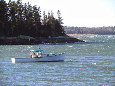 There were a couple of snowy, sleety days but most of the week was like this: stiff cold breeze usually NW, sometimes gusts to 30-40 knots. The Reach looks green when it is whipped up by that sort of wind. Last Sunday, Nov 24, there were stranger gusts than anyone around here had seen in a long while. Waves dashing through Center Harbor and breaking over the shack on the Brooklin Boatyard dock. A very intense day. Very glad Scout was hauled a month ago. John White's lobster boat, Acadia, was being hauled at the boatyard.