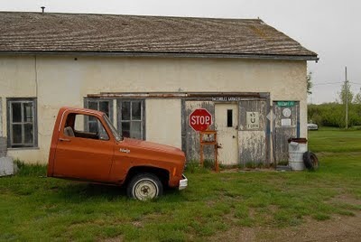 AE: "I now take you to Shackleton, Saskatchewan,where the streets are named after Antarctic explorers. Not a lot left but it is a very charming place. Here we have "ASSHOLE'S GARAGE " How lovely! In an adjacent yard is this sweet old grain truck."