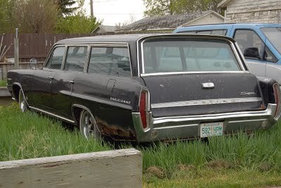 It's a 1964 Pontiac Parisienne stationwagon. The Parisienne was a Canadian Pontiac, top of the full-size Canadian Pontiac lineup, which also had a Laurentian, and a Strato Chief. Canadian Pontiacs of this era were actually Chevrolets: they had Chevrolet engines and systems; everything but the sheet metal was Chevrolet. In 1959 my father, HHB, had the only real honest-to-goodness Pontiac in Montreal: a 1959 Catalina. 1959 was the first year of the "wide-track" Pontiacs, in the US, anyway: the Canadian cars had the new wide track body on top of the skinny old Chevrolet frame. So they teetered, like boxcars, on wheels and tires that looked ridiculously inboard, as on this nice original Pontiac Laurentian, below.