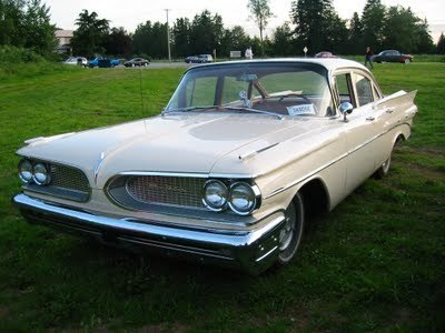 In 1959 my father, HHB, had the only real honest-to-goodness Pontiac in Montreal: a 1959 Catalina. 1959 was the first year of the "wide-track" Pontiacs, in the US, anyway: the Canadian cars had the new wide track body on top of the skinny old Chevrolet frame. So they teetered, like boxcars, on wheels and tires that looked ridiculously inboard, as on this nice original Pontiac Laurentian, below.