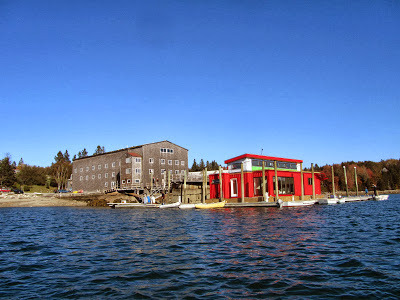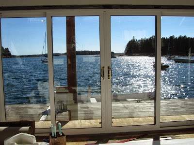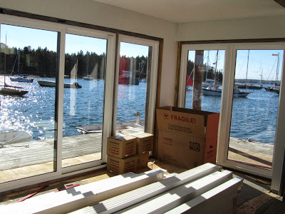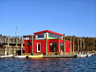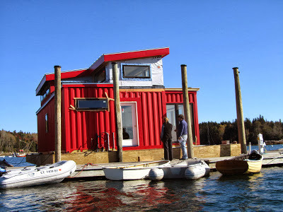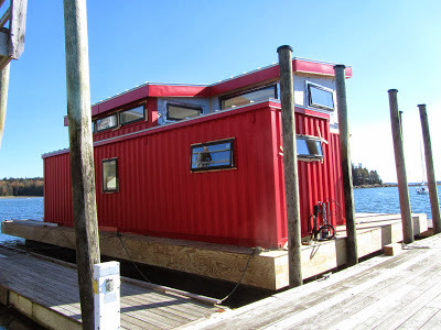 The houseboat was built over the summer in Brooklin, Maine for Steve White, owner of the Brooklin Boatyard and one of the owners of Front Street Shipyard in Belfast, Maine. Steve will use it for living quarters in Belfast Harbor. The project began as a couple of steel shipping containers.