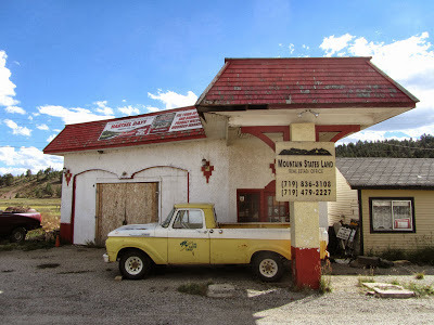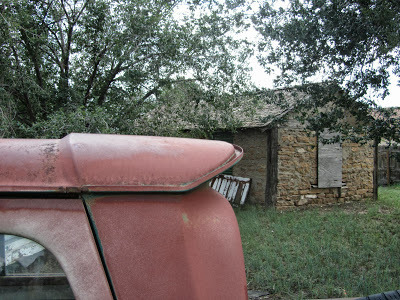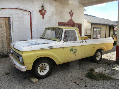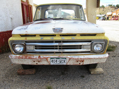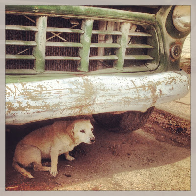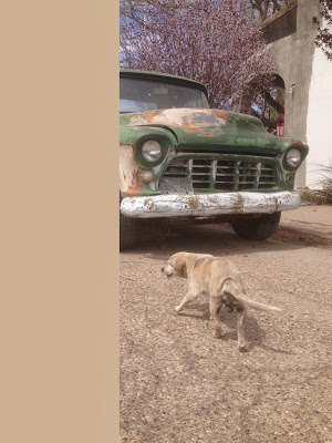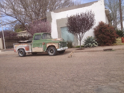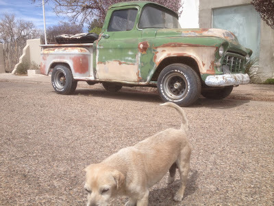 Tom Michael, founder and manager of Marfa's NPR station, KRTS (Radio for a Wide Range) sent these photographs. The truck is and always has been one block east of the Hotel Paisano. The dog is Spinoza. Most Marfa dogs are chihuahuas; or, most of the dogs that come snarling out of their yards to chase after my bike are chihuahuas.