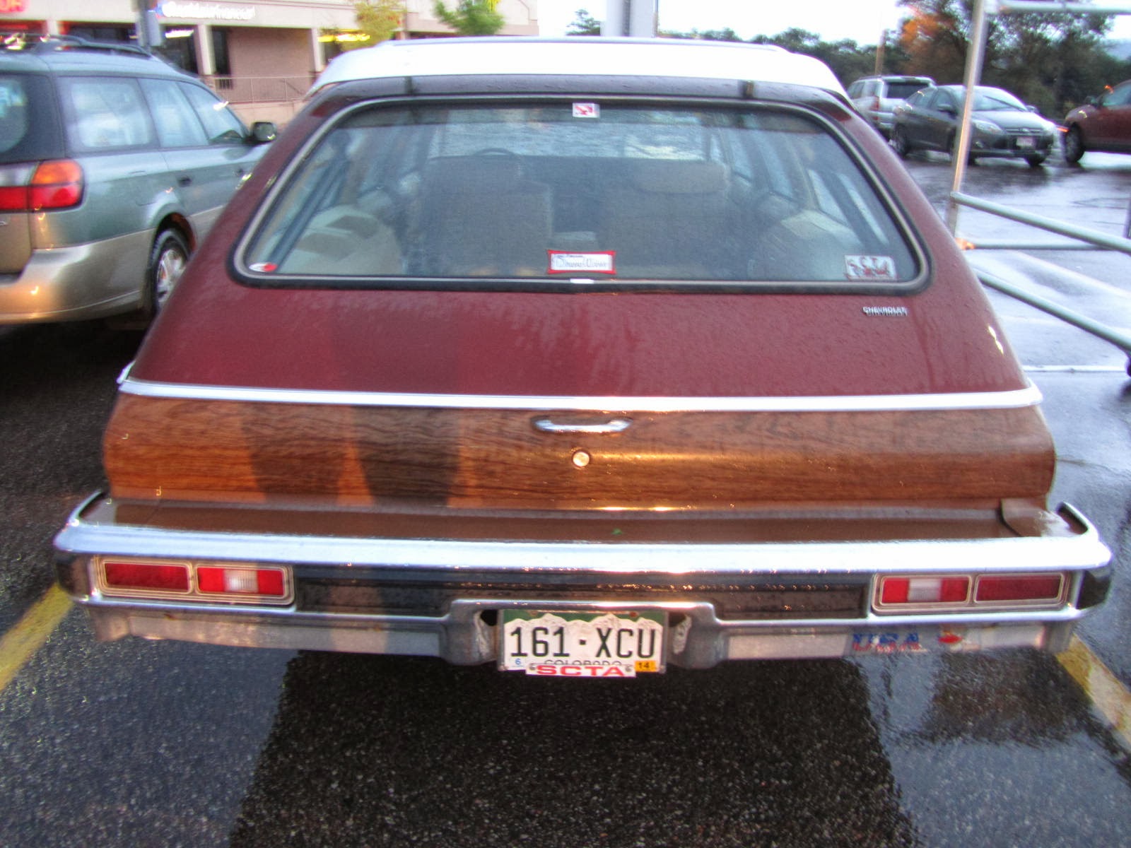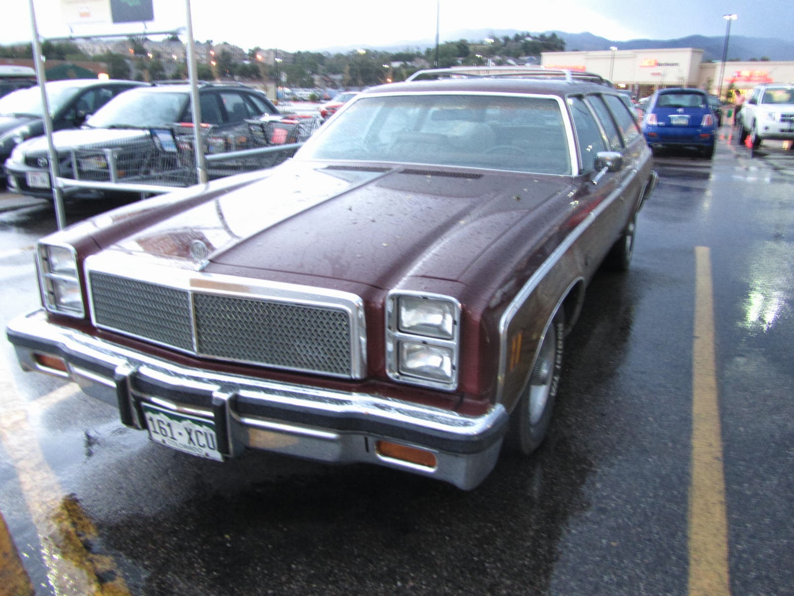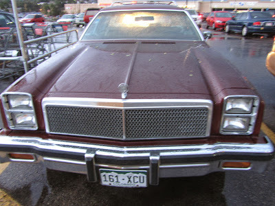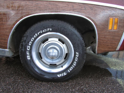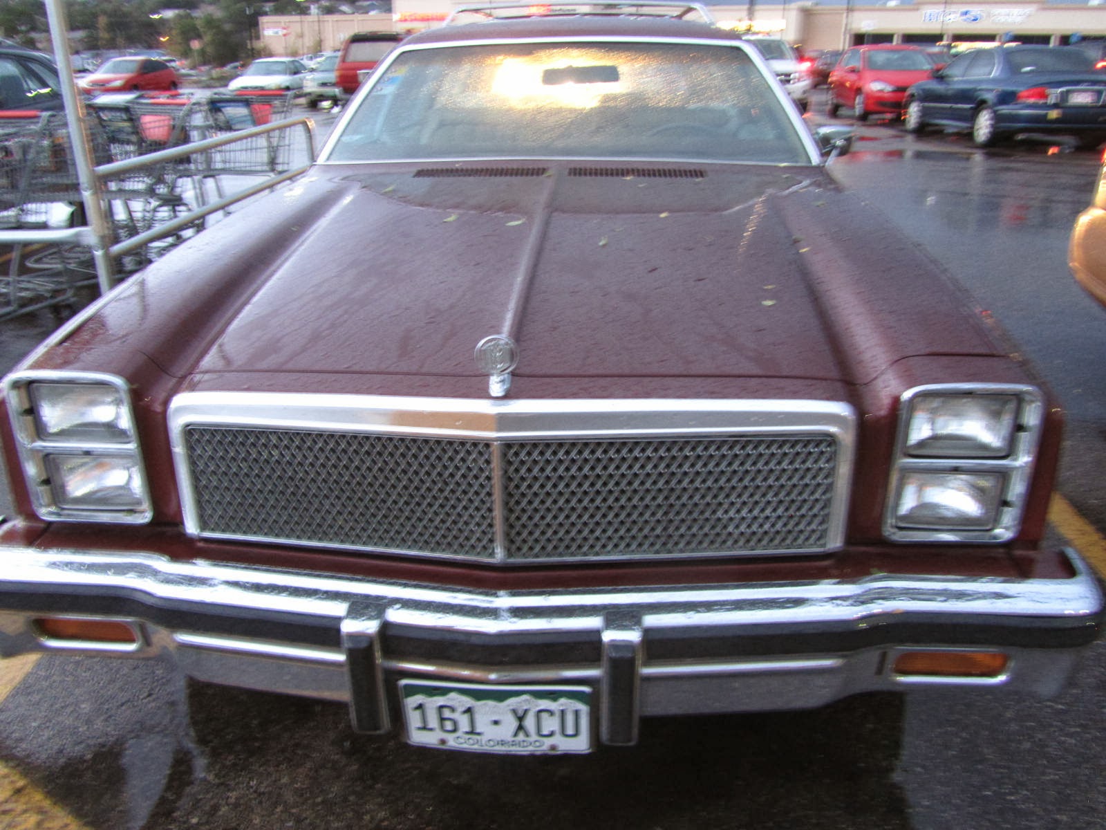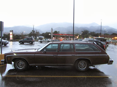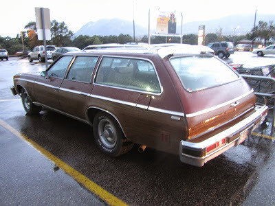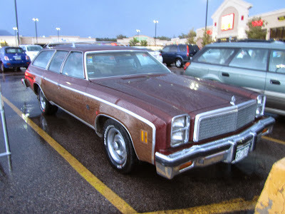 Caught this wagon, vinyl woodgrain and all, on a rainy evening in a supermarket parking lot here in the Springs. Oh boy, a sleeper. The moral equivalent of a '61 Biscayne 409. My kind of car.