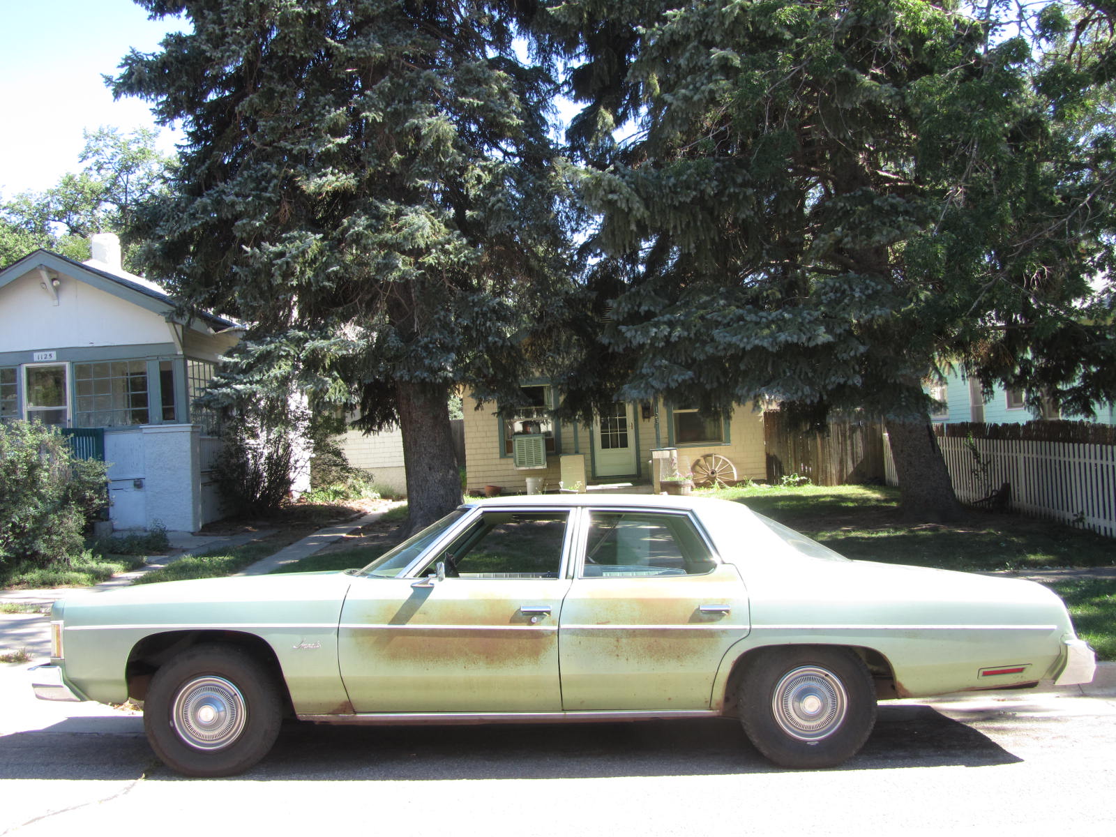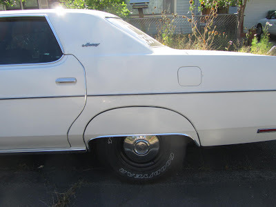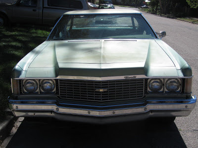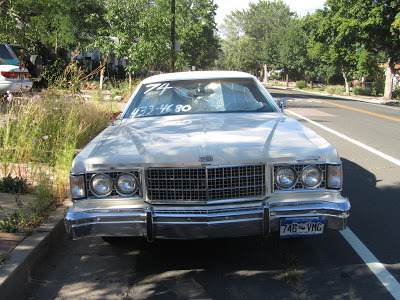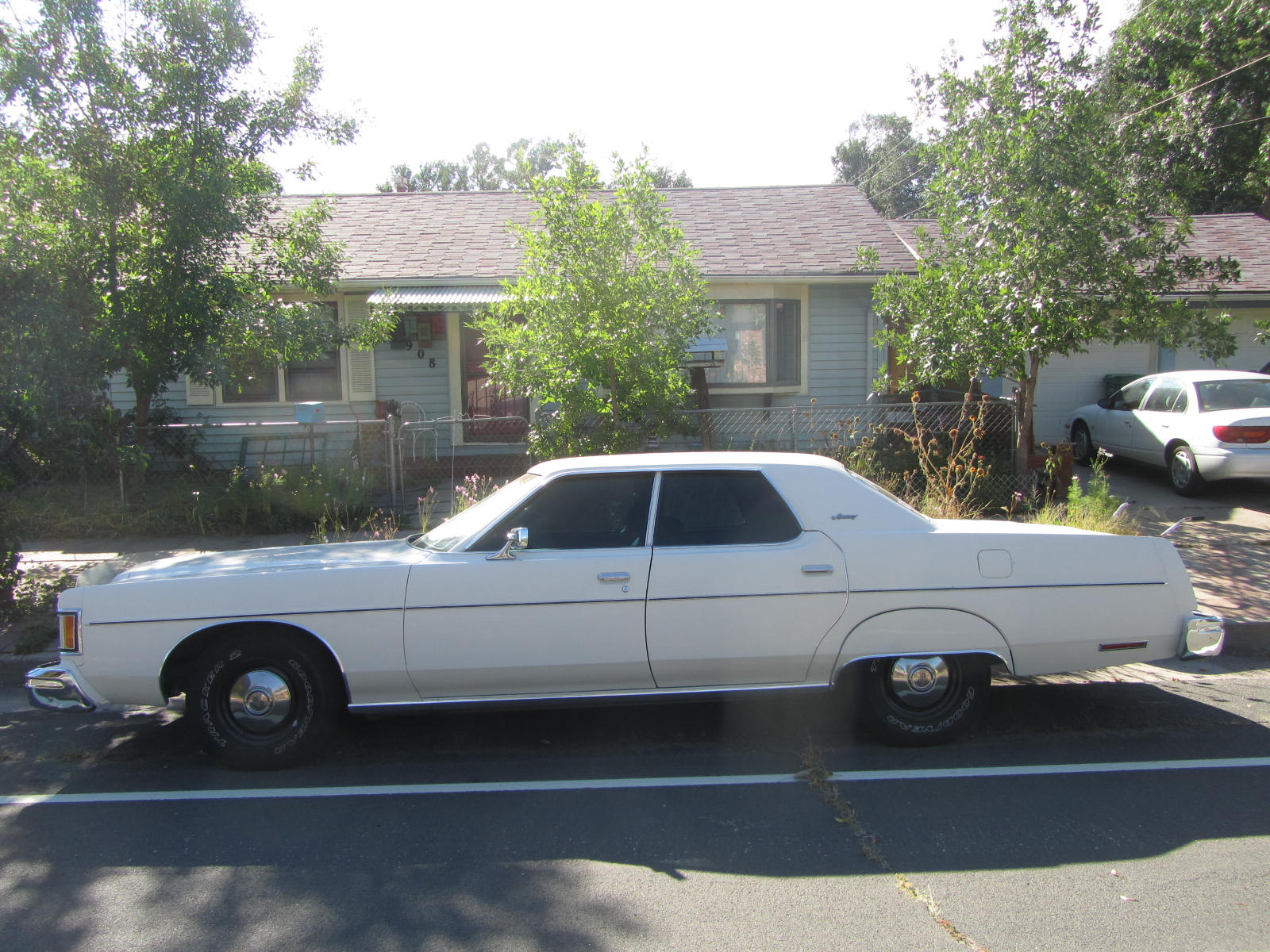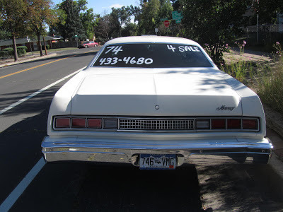 These were the dinosaurs, already rolling off assembly lines when the 'oil crisis' hit with the Middle East war in October 1973. and pump prices started going up. The Merc is an extraordinarily clean car, looks like everything's original, and it's for sale. The Impala is not quite as pristine but appears solid and original. Probably these were grandparent cars. A road trip in either would be like driving your living room cross-country. Found them within a couple blocks of each other, in the Patty Jewett neighborhood on Colorado Springs.