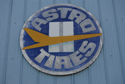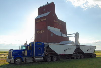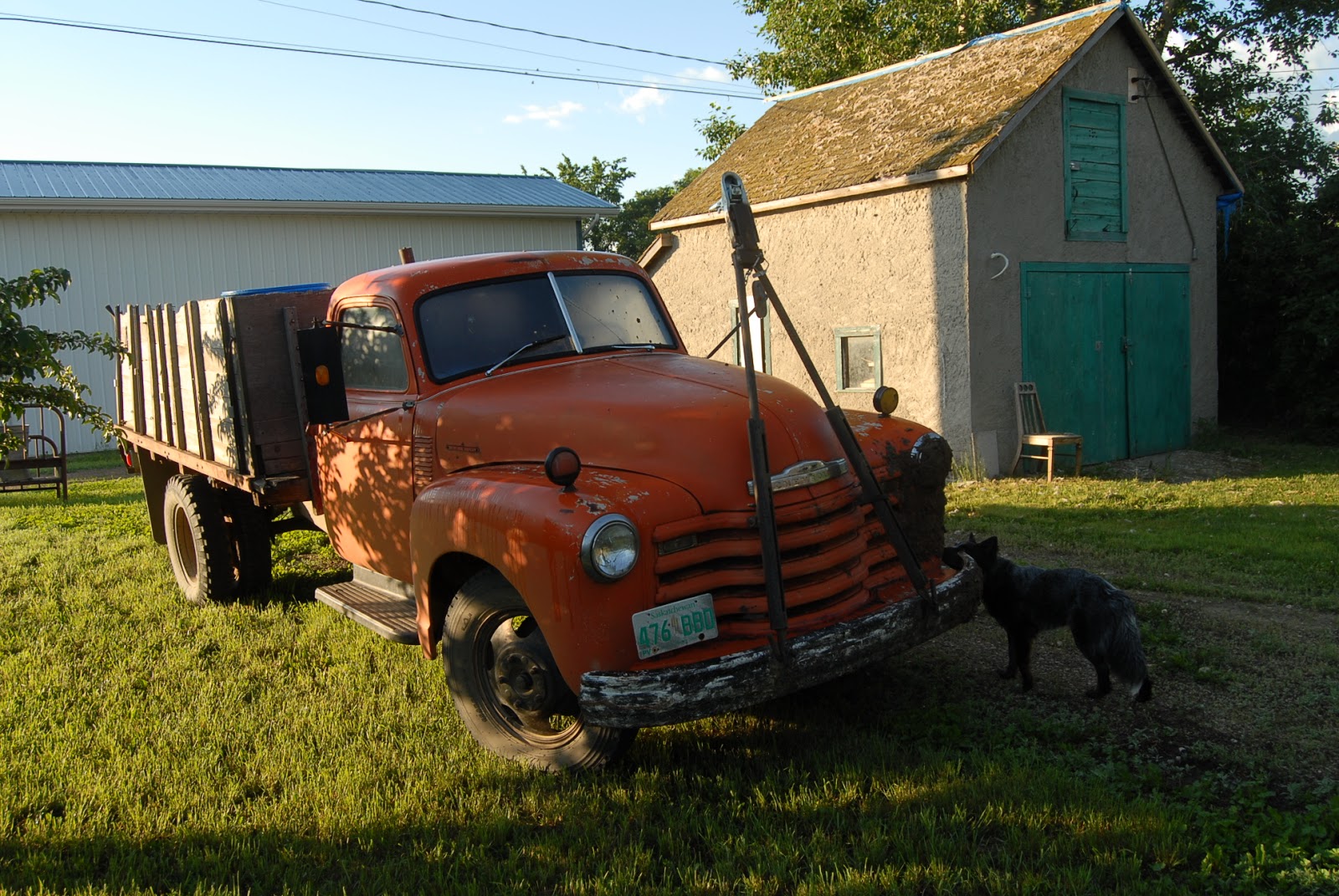 "I don't think I'll ever run out of old trucks out in prairieland.... I've got Bob the Roofer poised to redo the roof on my old garage and here is his '49 Chevy, which you have seen before, but not in my yard. Sometimes, when he is working alone he tows the beast so he can use his late 80's pick up to get around in, while the Chevy gets loaded with old shingles. The old tire sign is on the outside of Ray's Auto and Tire, in Ponteix. Ray was the current owner's dad. The monster truck/grain hauling behemoth is the modern successor to the 5 ton grainers that you see everywhere."--AE