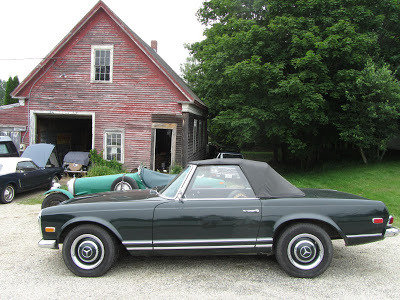 Stopped at Affordable Performance, Sean McKay's car shop on the Naskeag Road (across from the cemetery, next to the Beth Eden chapel.) One of the first machines I saw was this spritely Benz. I'll post later on the beater 1995 GMC that Sean is psyching-up to run at Loring Timing Association's 2.5 ex-airfield strip this weekend, way up in The County. Zooming old airstrips: boys, this is going back to gearhead roots of the mid-late 1940s, when abandoned airfields (and California dry lakes) were the early venues of our kind of racing. Speaking of roots, have a look at the current issue of Hot Rod for a profile of the last 50 years of making things go faster. On the other hand: back in the May 2013 issue HR ran a sharp piece by David Freiburger on the problem of nostalgia ("Nostalgia: Getting Old?"). The problem may be bigger than billet.