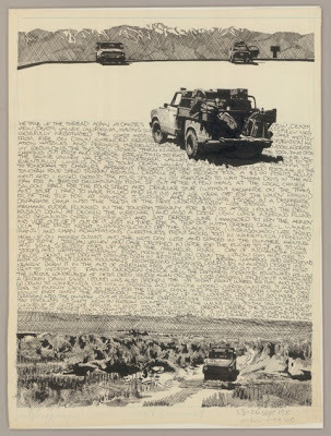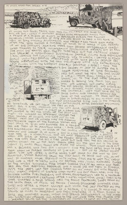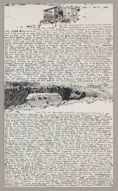 "I don’t know how it all started, probably around the time “Blood on the Tracks” came out, but for some reason, having discovered drawing from photographs and then tracing from slides in pencil to subsequently “color in” in pen and ink, I had the idea of documenting my life in cars. Or the cars in my life up to that time, or something; not “interrogate”, just record, with random reminiscence. That was about 1973 and I probably started with what I was driving at the time, which would have been a’60 Chevy shortbed, my first pickup, then worked backwards to the pre-slide era, crudely approximating the ’41 Dodge that saw me through my last years at Stanford, and “Xylo Intimides”, the VW cabriolet that I had there through my first years in some debauch and several non-fatal [obviously] crashes. By the time I arrived at my first automobile, a 1938 Chevy bought for $35 from an ad in the La Canada “Valley Sun” in 1958, and was looking, in that pre-internet age, for an image I found one parked in front of our house on Carl Street, so took a slide, which solved the problem nicely. It was a coupe [mine had been a two door sedan] but the front views were identical. The series continued sporadically until 1978 when life intervened, becoming considerably less predictable; when I returned to drawing several years later I mainly only drew in books and didn’t return to the Auto Biographies until restoration work in the wake of the Loma Prieta Earthquake of 1989 precluded daytime studio work, so I took it up as an evening endeavor and in the subsequent 23 panels caught up twelve years to end just after my father’s death in the spring of 1990. "Another long hiatus ensued, though not without several narrative series concerning Explorations, The Dream of a Home in the West, and, in late 2001, Politics. I kept cheap reproductions of these or, in the case of the Dream of the Home, copied all fifteen pages by hand for myself and additionally created from memory a narrative of everywhere I’d ever lived as well as certain other non-narrative binges of drawings, abstract, imagined or in one case using digital images sent by my son while he was visiting Afghanistan with the 82nd Airborne. "The Auto Bios remained on my mind, but I did nothing about them until the opportunity of an exhibition to explore the buildings and life behind my wife’s and my artworks; I’d recently seen a show on the history of our local arts organization in Benicia which used a timeline around the gallery to great effect and thought maybe I could use the Auto Bios in a similar vein for ours…having forgotten of course that by now they were over twenty years in arrears and that many different concerns had arisen in the interim which might complicate such an effort."Nonetheless, in December of 2012 I began digging into my archives [slides and journals where applicable] and decided to bring them as close to the present for the show as possible, using a format similar to where I’d left off in 1990, although by now the stories expanded well beyond vehicles [had already] to include house and studio building, dogs, life, death, other works and humans as well. The writing, “text as texture”, is an uncorrected [uncorrectable, really] stream of consciousness first draft that ambles along prompted by, for the most part, images in my much-edited library of slides. Although at first I began, I think, with the images, and built the words around them to fit, by the end of the first thirteen images [1958 – 78, done 1973 – 78] the images had become embedded in the narrative. The circumstances of production varied, too; for the first thirteen, in the seventies, all the work was done at night with few interruptions, and mostly stoned, high above Carl Street in the Inner Sunset of San Francisco.. After the earthquake I worked nightly in my Guerrero Street studio in the Mission, unstoned but pretty much uninterrupted.