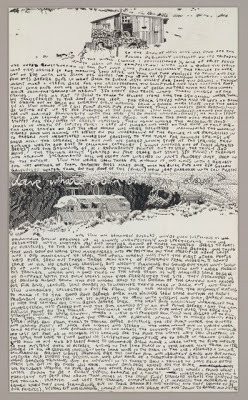 "The most recent emanation, twenty-three years in fifty-three pages, was accomplished between December 2012 and May 2013, beginning with that major research/organizational /mapping effort to unearth materials and recover memories. I found I was able to review slides and do the sketches as potential illustrations came up in the text, carrying on by daylight with the writing though inkings the drawings could only be done in darkness. By the end the slide record became extremely minimal, impacting both recoverable memory and available imagery, so beyond 2011 I relied on digital pictorial files, at times converting likely subjects to transparencies for drawing. As most of the writing was done by day in my Benicia street-front studio, it was subject to the interruptions of deliveries, mail, and a procession of idiots ringing doorbells for no reason, so the storyline progresses by fits and starts, dipping in and out of lists, digressions, loopy detours, rants and etc….and probably scans accordingly. " Nonetheless, I was surprised and gratified to reach the present day, for whatever it’s worth. "To be continued…” --MSMLinda Fleming's and Michael Moore's show, Making Places opens at the Center for Contemporary Art in Santa Fe July 12.