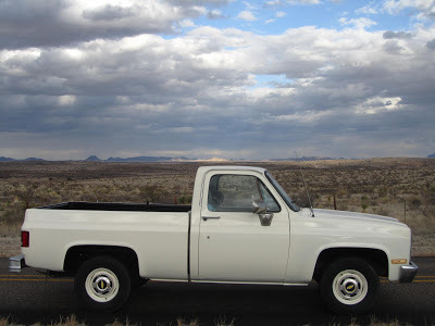 NYT piece today on DJ's digs in SoHo. And below, one of our favorite spaces at Chinati, the Judd (museum? institution? cavalry post? antelope refuge?) in Marfa. And here's a link to an Autoliterate link to a NYT piece on Judd's Dodge Power Wagon. And below, below, because my whole family is missing West Texas badly, a photo taken on that old beloved Pinto Canyon Road. And hell, since we're already on the Pinto Canyon Road, may as well get a truck shot in.