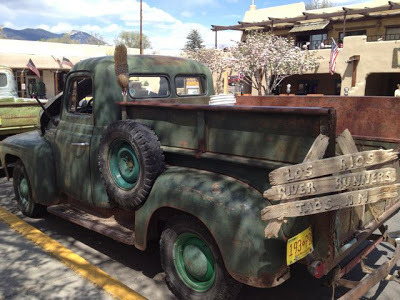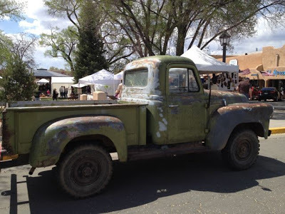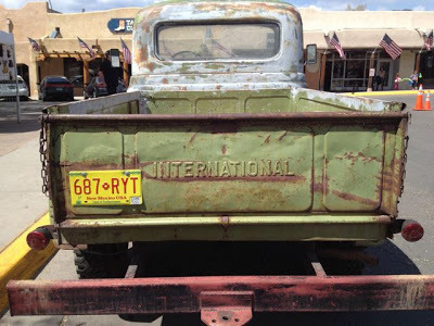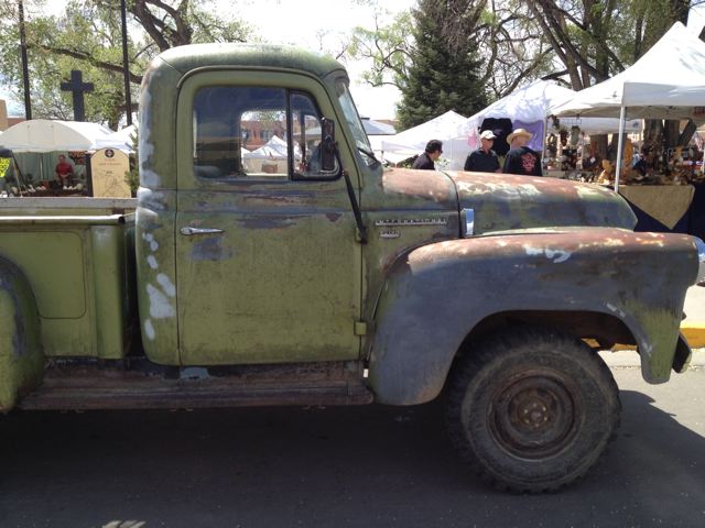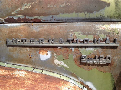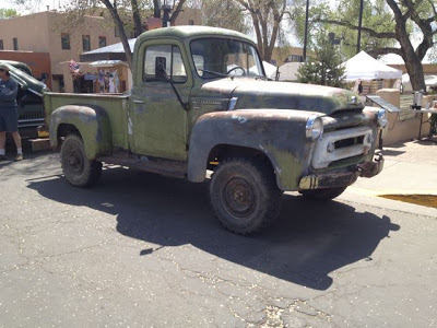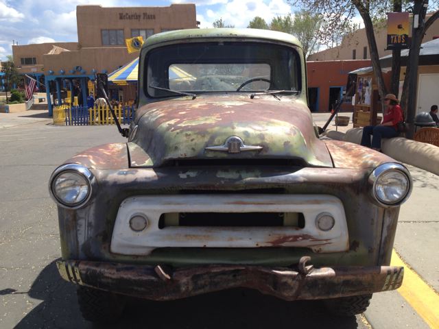 "We stumbled on a vintage truck show in Taos, waypoint on our drive home to LA. Mostly souped up and ugly ones not worthy of autoliterate. but there were two terrific 50s International trucks, this one was my favorite. I'll send photos of the second separately."1956 International S-120 series. Local owner Evan Earl bought it or bartered for it from someone he was working for here in town. It had been abandoned, outdoors - probably most of its 50+ year existence. He got the wheels turning and then the engine running with minimal work. Original engine. Original paint (what's left) and only surface rust.