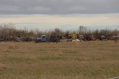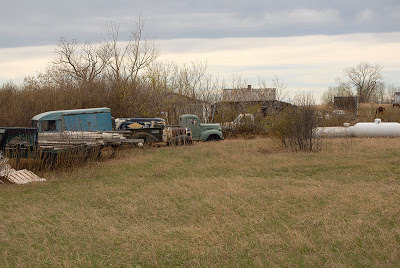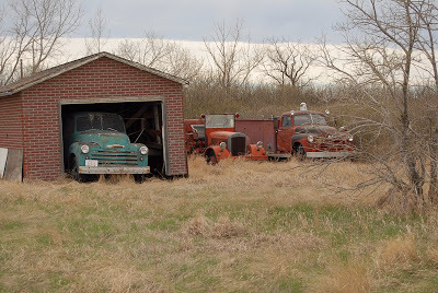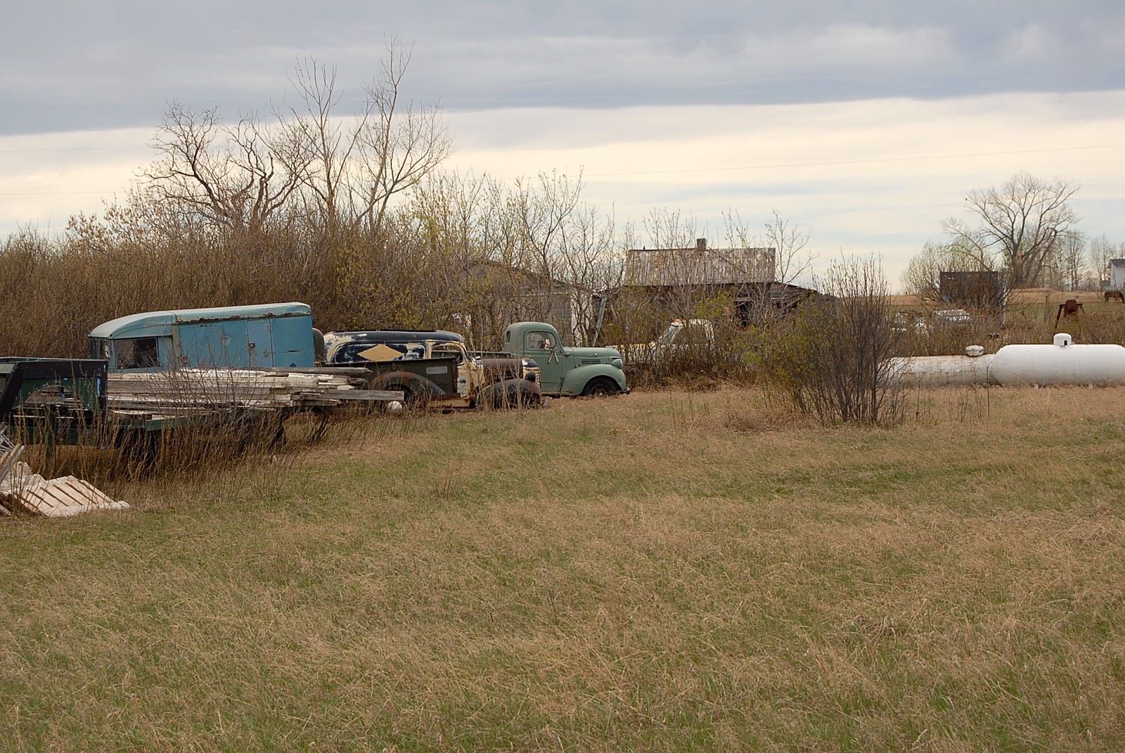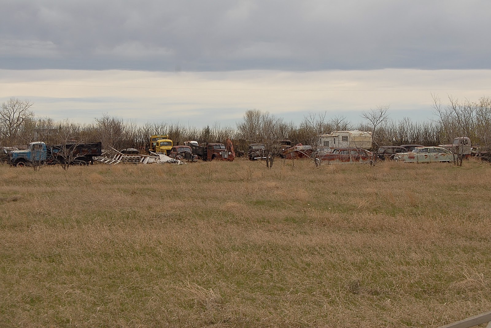 "Have a look at this yard which was just south of the Hwy#1 near the turnoff for East Gleichen (Alberta). I have to try and talk to the owner someday, to get permission to take closer photos . Large signs saying Keep Out , Nothing is for sale, No Trespassing, etc. But I have never seen such a cluster of rare , choice old vehicles, just lying around. Sensing a crazy old hoarder dude in the vicinity"--AE