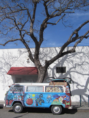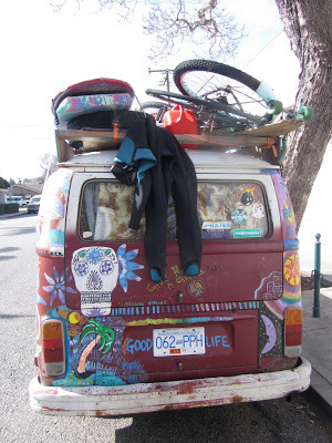 The bus was parked a couple blocks back from the beach in Carpinteria,Calif.--a couple miles up from the Rincon. Wet suit hanging out to dry. British Columbia plates.