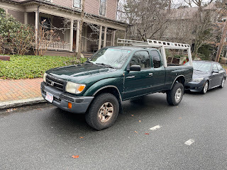 Above, about as a basic a Toyota Tacoma as you will find, and therefore quite rare: a 2WD single cab. Below, an earlier edition 4wd Tacoma, definitely a work truck. Toyota practically owns the wheelbarrow genre, though there are exceptions.