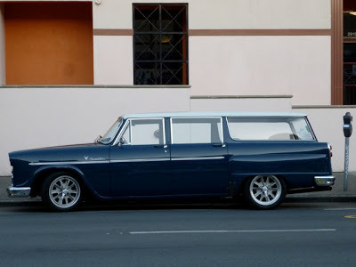 From our man in the City:"It seems to say " V-8 Marathon" on the side; Mission Street, SF, last Friday...I meant to investigate when I walked back on the other side of the street but it was gone. Custom rims on a lowrider Checker wagon?"-MSM