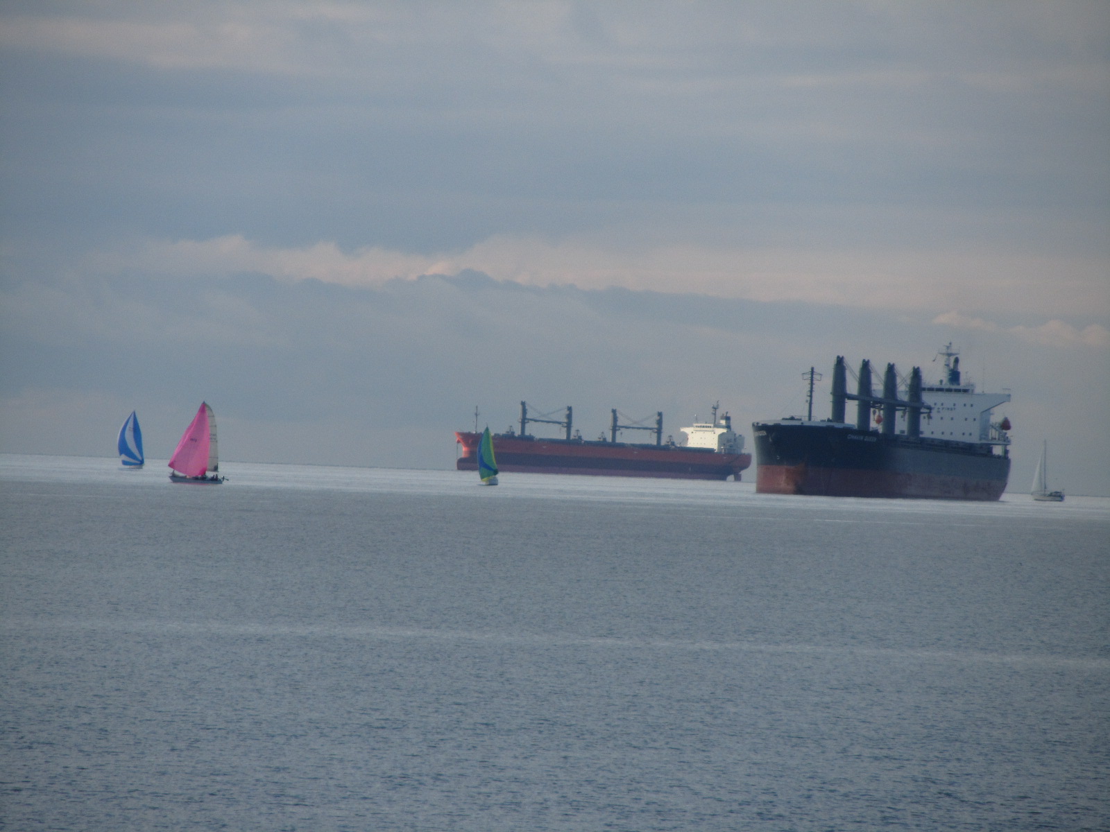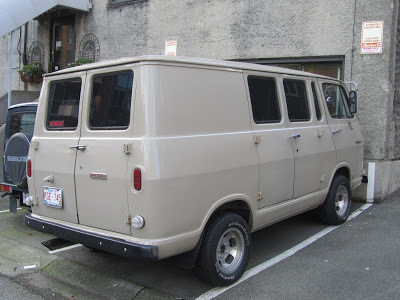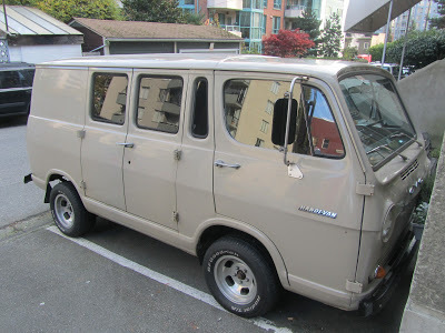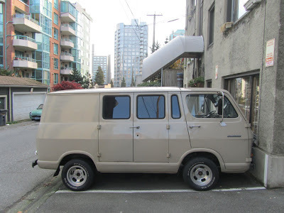 Parking's tight in those alleys in Vancouver's West End. Was taupe a factory color? Seems kinda Giorgio Armani-esque for 1966. Very clean little van though. Found it in an alley a few blocks from English Bay. Walked around the corner, and there was the Bay, with freighters on the nod.