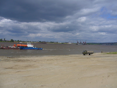 from Guido Goluk: 'this photo was taken by my friend and cycling pal Djoen Tong Liem. It's a ferry across the River Irtish at Tobolsk, a fort founded by conqueror Yermak in the late 16th century to keep the Tatars out, and for a long time the capital of Siberia. The little truck on the right is the ubiquitous UAZ452, a model that has not been modified for the last 50 years. The Russians call it bukhanka (loaf of bread). The orange tanker truck, a Kamaz, was backed up onto the ferry straight from the river bank, no ramps, no quay, just directions yelled through a bull horn by the skipper'--GG