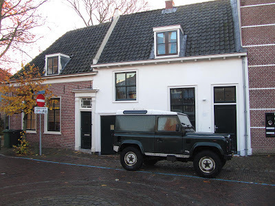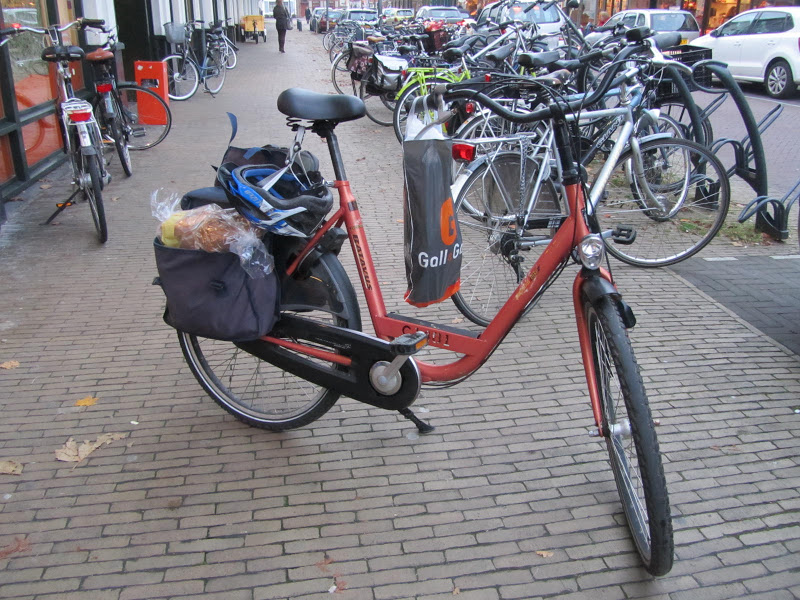 Dutch bikes are designed for urban life, and sturdy. It's common to see parents wheeling along with one kid mounted on a seat on the handlebars, another sitting on a seat over the rear fender. No one except visiting Americans wears helmets. The Dutch were serious cyclists long before the helmet thing started. Bikes are just a way of life here, and motorists know how to deal with them. (And beyond the reach of American liability lawyers, life usually does become a little less...restrictive, does it not?) The threat to ordinary vernacular bikers is not vehicle traffic, but hordes of road bikers moving at speed, silently, and very often in packs. (None of them have bells either, which is usually how Dutch bikers signal they are coming up behind; I guess the road racers figure that with all the expensive form-fitting suits and aerodynamic helmets, a bell on the handlebar would...what? Disrupt the airflow?)