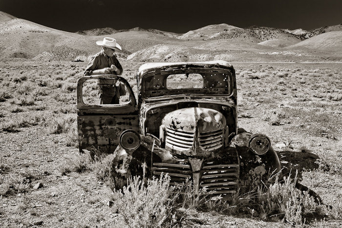 "I keep thinking about Don ordering that thing up to spec back then [he was, of course, quite adept at ordering to spec, as everyone in the art world knows]...a 360 with creeper gears, four wheel drive of course, and then the winch... I woulda gone with a beefier front bumper but in '82 I was just cobbling my whatevers together [I think by then, having rolled the Willys, I was back with my faithful 4x2 1967 Chevy, 350, four on the floor compound low]...and carrying, of course, a whole lot of the kit described as still being on the Judd truck. Sweet...never ever did I have to replace a fan belt, or any of that other stuff [distributors, waterpumps, etc.] they always tell you to have [some of which I didn't...including, knock on wood to this day, that elaborate sort of first aid kit he has there in the door, but since I faint at the sight of blood, particularly my own, so a t-shirt tourniquet is about the best bet]. Anyway, I wrote the above day before yesterday but superstitiously didn't want to jinx my trip to the Seven Toughs Range by possibly becoming stranded without a fanbelt or emergency amputation materials, neither of which seem to be onboard the Tundra so tossed the second spare in the back and had a lovely trip over the ranges to the abandoned town of Vernon, where I'd hoped to take some enticing pics of vintage vehicles in the landscape..."