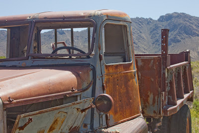 Anyway, I wrote the above day before yesterday but superstitiously didn't want to jinx my trip to the Seven Toughs Range by possibly becoming stranded without a fanbelt or emergency amputation materials, neither of which seem to be onboard the Tundra so tossed the second spare in the back and had a lovely trip over the ranges to the abandoned town of Vernon, where I'd hoped to take some enticing pics of vintage vehicles in the landscape..."