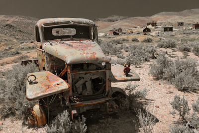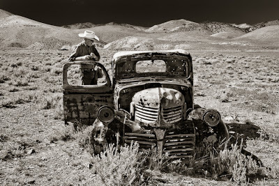 "But I didn't; these were all taken by my brother, William Kirk Moore [], from a trip there several years ago; now everything's gone! Having always been of the opinion that these relics are, beyond the picturesque, a poignantly evocative manifestation of the history and labor of the places they came to rest I was devastated. I'm currently trying to find out whether this was the result of some misbegotten BLM cleanup policy or renegade scrappers...or scrappers working at the behest of some misbegotten BLM policy. A friend of mine who photographs old industrial sites and prisons came upon a crew carting off a whole junkyard in the mountains south of Battle Mountain last summer under contract to a big mining company, but the ones I was looking to revisit were just individual, and to my mind historic, vehicles resting in place...kiinda like you're not supposed to pick up arrowheads or something. Particularly something as unique as the Walter, a huge old front wheel drive mine truck at Porter Springs;