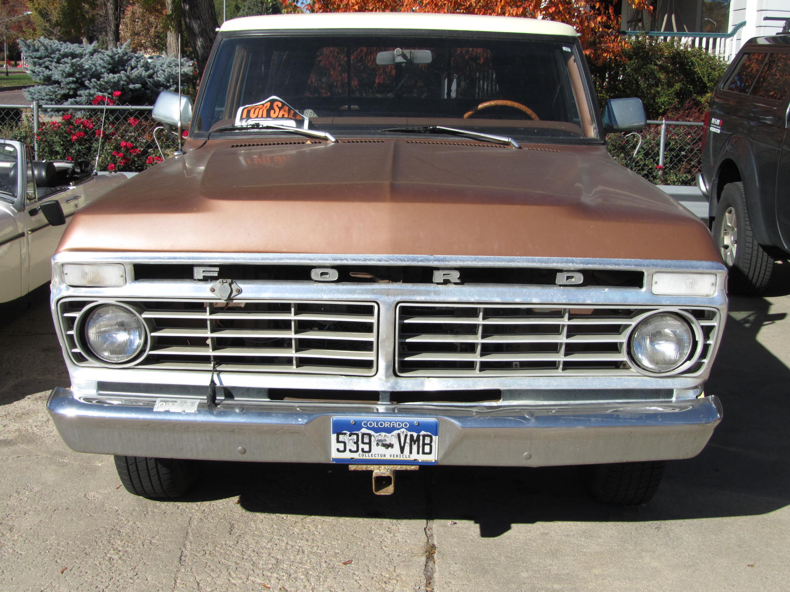This F100 was at a garage in Colorado Springs. The owner lives in Fort Collins. The guy I spoke to at the garage said he understands it's the 460 engine. Everything works. The garage has changed the plugs, wires, fluids, etc. It apparently runs well. Looked very clean to me; a couple of tiny specks of rust, but nothing underneath. Seems a very original truck. Maybe a 1977? I'd probably lose the cap, because I don't like the way they look. And I'd get slightly bigger tires. No whitewalls. But it looks a very clean and well-cared-for original. Interior looked good. The sign on the dash says '$2500 obo'. Sounds like possibly a deal, if you're ready to adopt an old truck. If you're interested in learning about shipping, the people I would recommend, strongly, are www.safewayautotransport.com They moved a truck for me from West Texas to Downeast Maine, and did exactly what they promised, for exactly the price they promised. They own their trucks, and the drivers are their employees, so you're not getting shifted around from freight terminal to freight terminal.