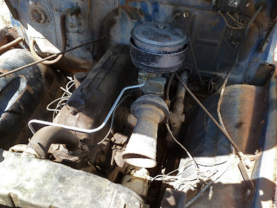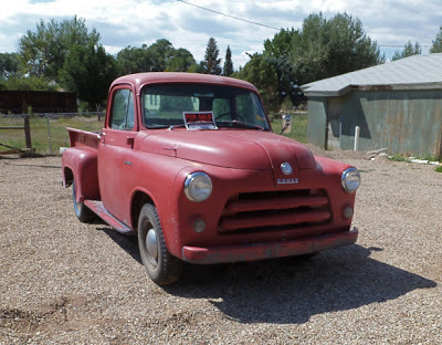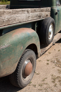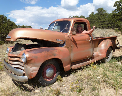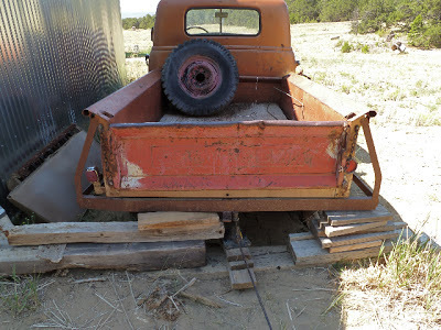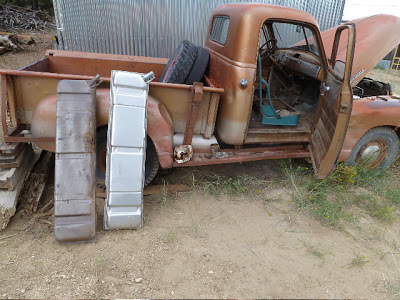 After a summer of erratic effort we got our '50 fired up enough to pull out of the mud and get parked just before we left; new gas tank, new fuel and vacuum lines, rudimentary carb cleaning. Next summer, maybe, we'll finally attach the body to the frame like it should be... ours is a "3100", which means half ton...Jarrod's looks like it has the longer bed, might be the 3/4 ton.