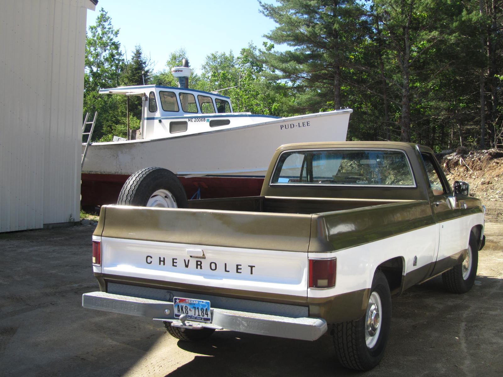 One of the spring rituals was getting our sailboat ready for launching. Scout spends the winter at Bill Grant's boatyard in Sedgwick; when I was slapping on a bottom coat back in June there were still a bunch of lobster boats at the yard, getting ready for action. There's something tuned and form-follows-functional that I admire about the blocky, workaholic lines of the 1976 Chevy truck and the swooping, graceful sheer of a Maine lobsterboat.